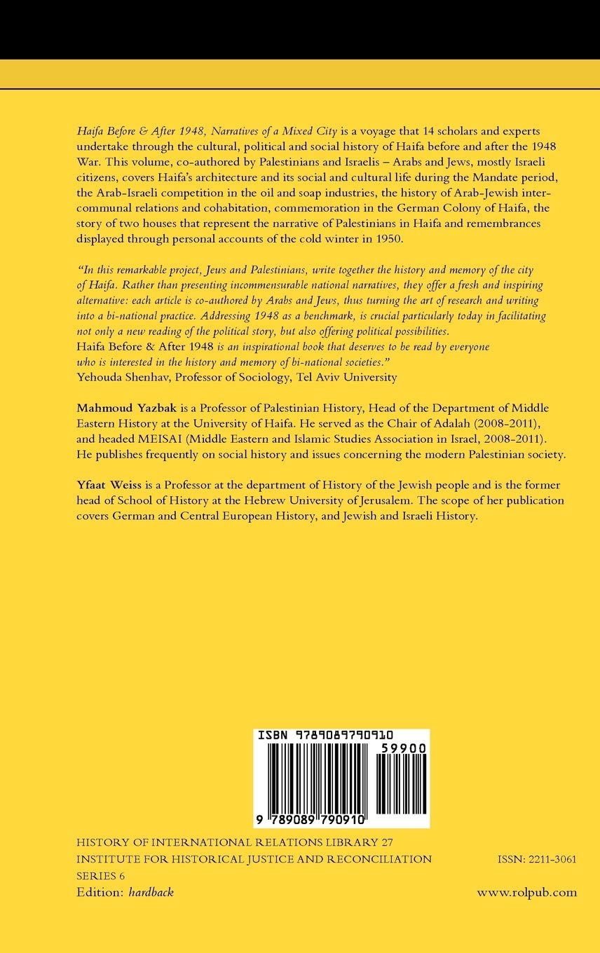 Rather than presenting incommensurable national narratives, they offer a fresh and inspiring alternative: each article is co-authored by Arabs and Jews, thus turning the art of research and writing into a bi-national practice. Addressing 1948 as a benchmark, is crucial particularly today in facilitating not only a new reading of the political story, but also offering political possibilities. Haifa Before & After 1948 is an inspirational book that deserves to be read by everyone who is interested in the history and memory of bi-national societies. (Yehouda Shenhav, Professor of Sociology, Tel Aviv University)