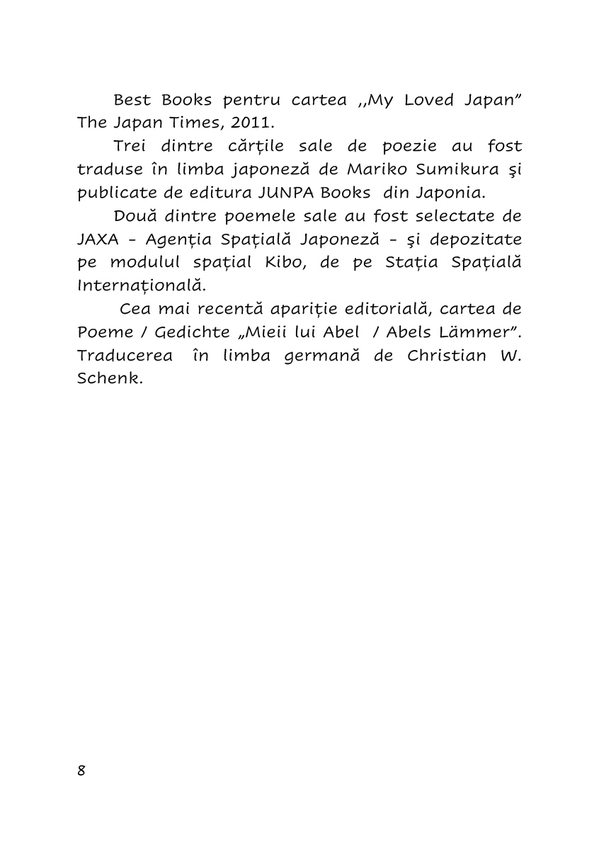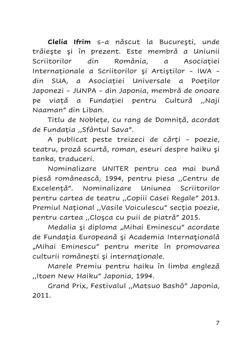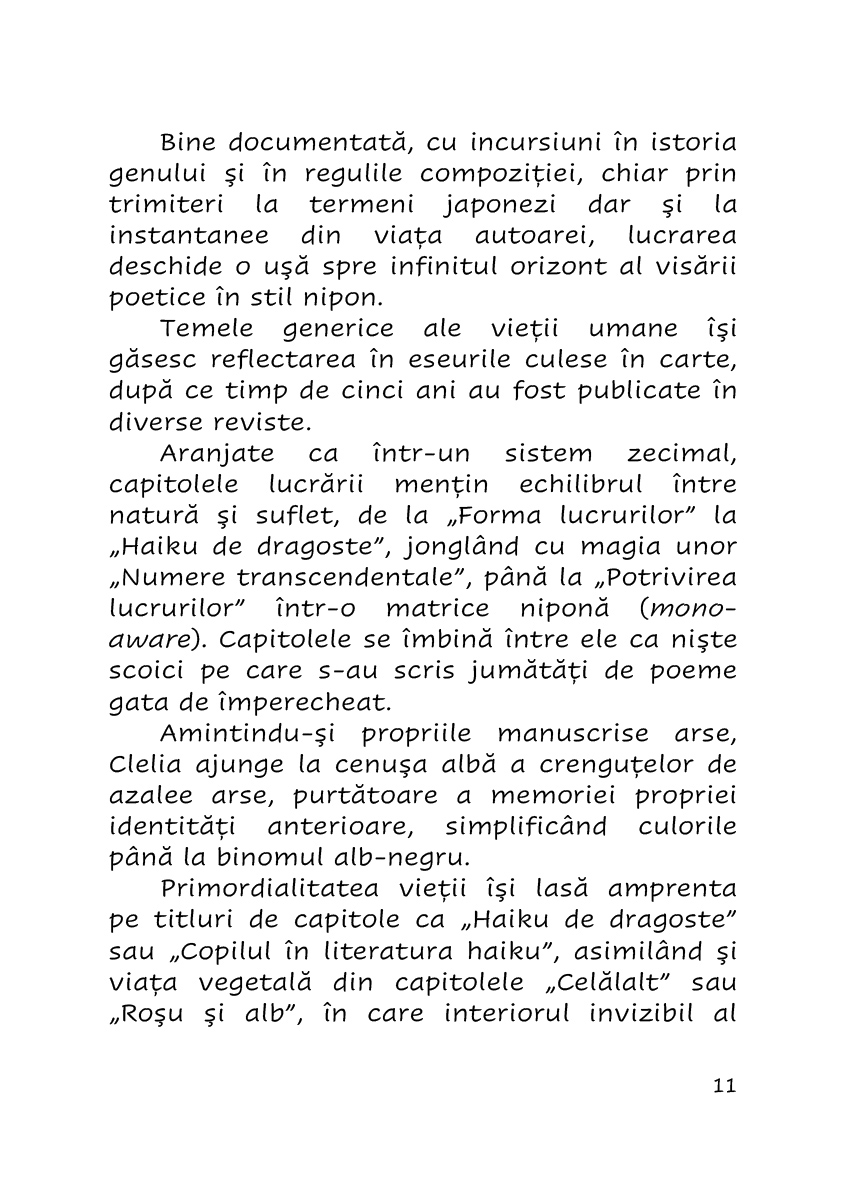 Bine documentata, cu incursiuni in istoria genului si in regulile compozitiei, chiar prin trimiteri la termeni japonezi dar si la instantanee din viata autoarei, lucrarea deschide o usa spre infinitul orizont al visarii poetice in stil nipon.