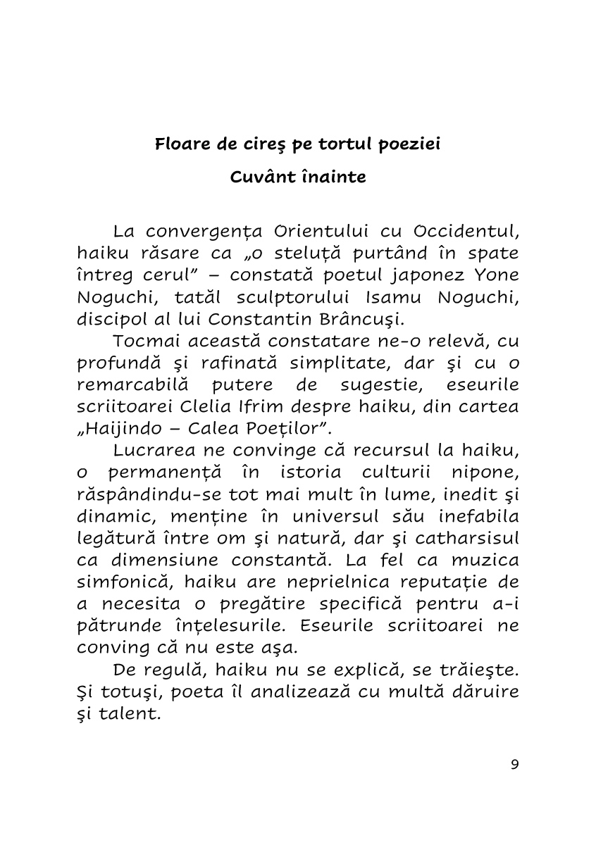 Lucrarea ne convinge ca recursul la haiku, o permanenta in istoria culturii nipone, raspandindu-se tot mai mult in lume, inedit si dinamic, mentine in universul sau inefabila legatura intre om si natura, dar si catharsisul ca dimensiune constanta. La fel ca muzica simfonica, haiku are neprielnica reputatie de a necesita o pregatire specifica pentru a-i patrunde intelesurile. Eseurile scriitoarei ne conving ca nu este asa.