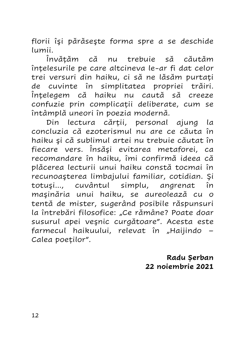 Citind-o atent, mi-am dat seama ca intr-o zi am putea sa asistam la infiintarea unei Societati Mondiale de Haiku, care ar extrage distilatul de poezie intr-o lume tot mai interconectata, in care inteligenta artificiala traduce instantaneu, lasandu-ne noua doar placerea savurarii unui haiku reusit, de undeva dintr-un colt indepartat de lume.