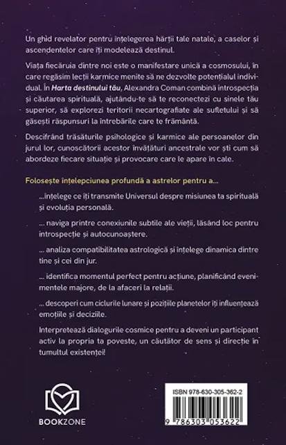 În Harta destinului tău, Alexandra Coman combină introspecția și căutarea spirituală, ajutându-te să te reconectezi cu sinele tău superior, să explorezi teritorii necartografiate ale sufletului și să găsești răspunsuri la întrebările care te frământă. Descifrând trăsăturile psihologice și karmice ale persoanelor din jurul lor, cunoscătorii acestor învățături ancestrale vor ști cum să abordeze fiecare situație și provocare care le apare în cale.