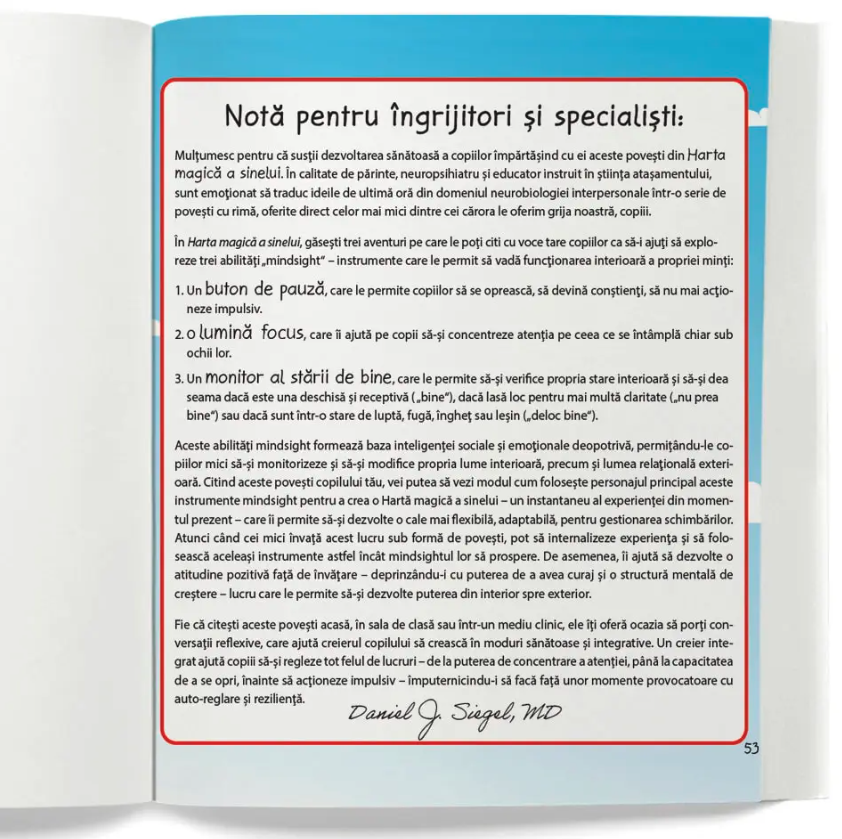 Cum putem să ne ajutăm copiii să treacă de la „Mă simt copleșit“ la „Mă descurc cu emoția asta“? Neuropsihiatrul cunoscut la nivel Mondial și coautorul cărții Creierul copilului tău, dr. Daniel J. Siegel are răspunsul: Harta magică a sinelui, pentru copii.
