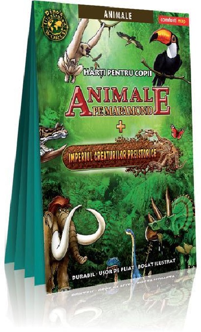 Aceasta harta pliabila deosebita, impermeabila, produsa pentru copii va starni curiozitatea lor si prin ilustratii umoristice despre fauna lumii noastre. Copiii au posibilitatea sa exploreze cu ragaz desenele cu animale, intre timp pot invata usor numele acestora, datele lor cele mai importante, locurile unde le putem intalni. Datorita executiei laminate, pliabile, copiii o pot lua oriunde iar desfacuta o pot pune pe perete.