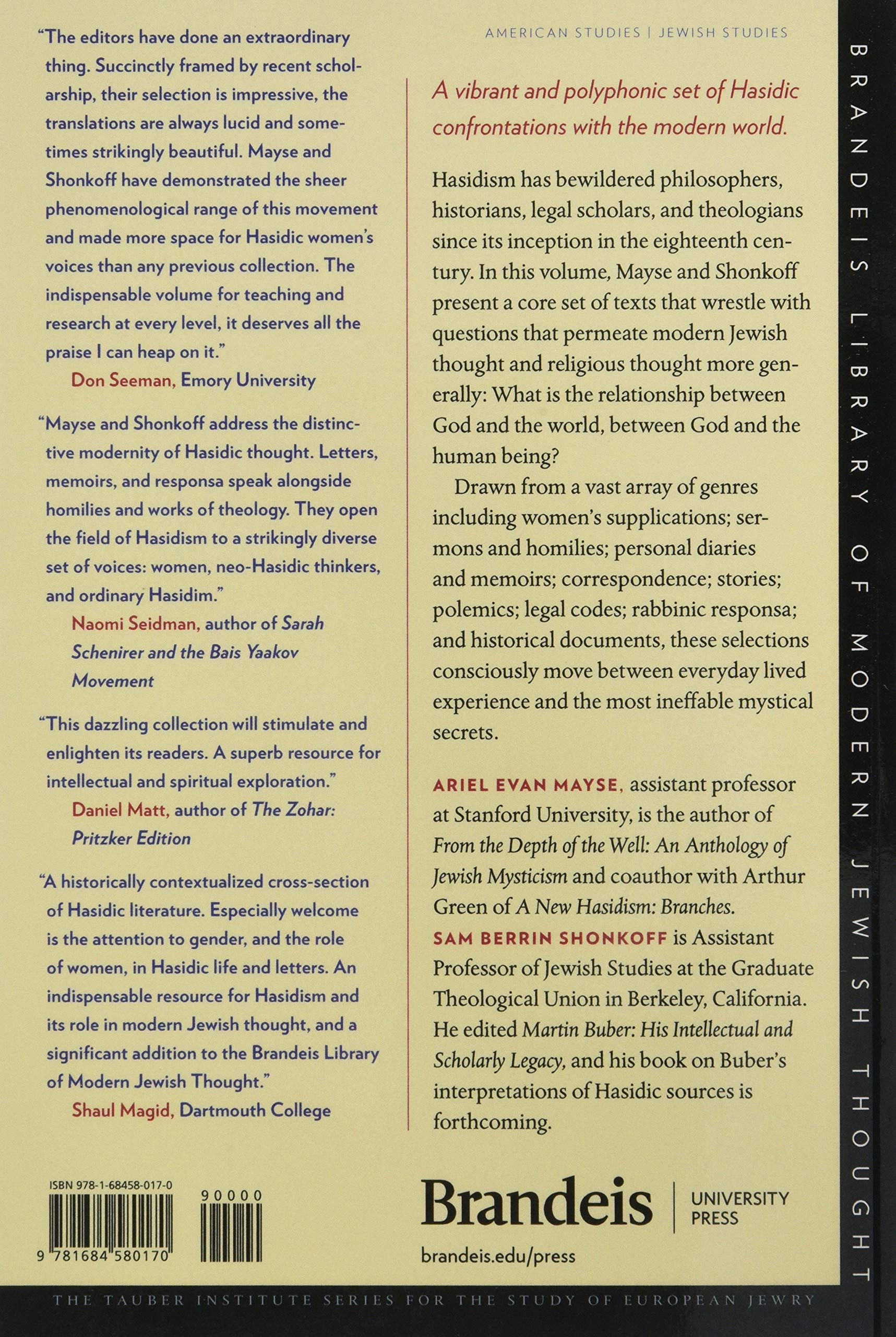 Hasidism has attracted, repelled, and bewildered philosophers, historians, and theologians since its inception in the eighteenth century. In Hasidism: Writings on Devotion, Community, and Life in the Modern World, Ariel Evan Mayse and Sam Berrin Shonkoff present students and scholars with a vibrant and polyphonic set of Hasidic confrontations with the modern world. In this collection, they show that the modern Hasid marks not only another example of a Jewish pietist, but someone who is committed to an ethos of seeking wisdom, joy, and intimacy with the divine. While this volume focuses on Hasidism, it wrestles with a core set of questions that permeate modern Jewish thought and religious thought more generally: What is the relationship between God and the world? What is the relationship between God and the human being? But Hasidic thought is cast with mystical, psychological, and even magical accents, and offers radically different answers to core issues of modern concern. The editors draw selections from an array of genres including women’s supplications; sermons and homilies; personal diaries and memoirs; correspondence; stories; polemics; legal codes; and rabbinic response. These selections consciously move between everyday lived experience and the most ineffable mystical secrets, reflecting the multidimensional nature of this unusual religious and social movement. The editors include canonical texts from the first generation of Hasidic leaders up through present-day ultra-orthodox, as well as neo-Hasidic voices and, in so doing, demonstrate the unfolding of a rich and complex phenomenon that continues to evolve today.