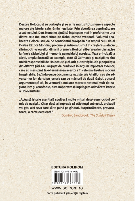 Despre Holocaust se vorbeşte şi se scrie mult şi totuşi unele aspecte majore ale istoriei sale rămân neglijate. Prin abordarea cuprinzătoare a subiectului, Dan Stone ne ajută să înţelegem mai în profunzime una dintre cele mai mari crime de război comise vreodată. Volumul analizează Holocaustul de pe continentul european din timpul celui de-al Doilea Război Mondial, precum şi antisemitismul în creştere şi atacurile împotriva evreilor din anii premergători ori eliberarea lor din lagăre la finele războiului şi memoria genocidului evreiesc. Teza principală a cărţii, amplu ilustrată cu exemple, este că Germania şi naziştii nu sunt unicii responsabili de Holocaust şi că atât autorităţile, cât şi populaţia din diferite ţări s-au angajat de bunăvoie în acţiuni împotriva evreilor, care au mers până la exterminarea acestora în cele mai brutale moduri imaginabile. Bazându-se pe documente naziste, ale Aliaţilor sau ale adversarilor lor, dar şi pe jurnale sau pe mărturii de după război, autorul argumentează că, în vremurile noastre marcate tot mai mult de naţionalism şi xenofobie, este imperativ să înţelegem adevărata istorie a Holocaustului.