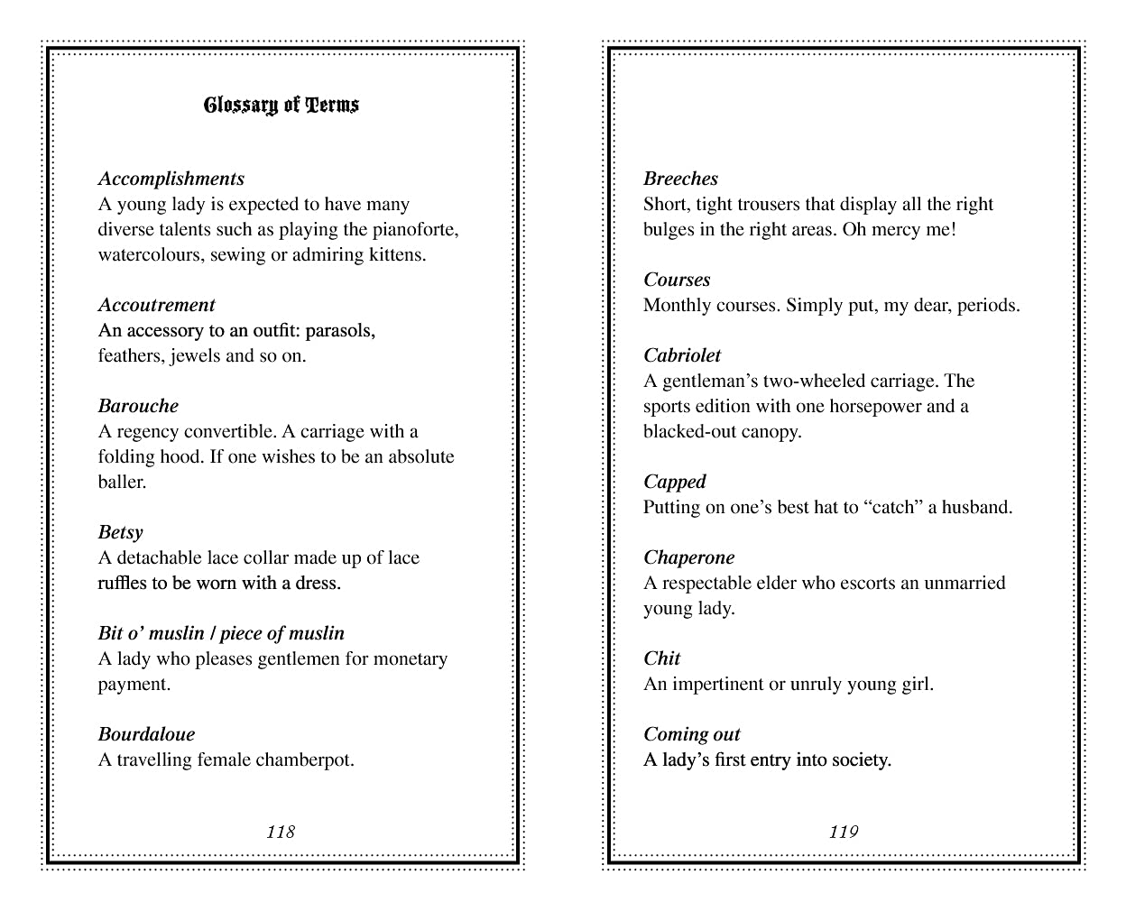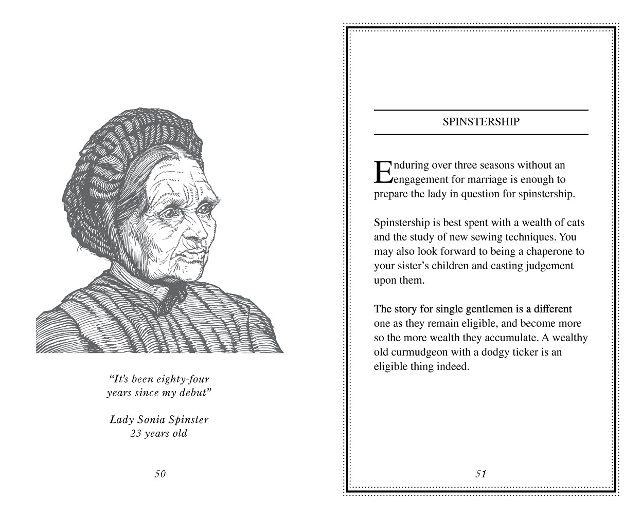 Welcome to the definitive guide to navigating the social season. Learn about etiquette in all its forms. Within these abundant leaves you will be gifted with all the instruction and patronage necessary to take your place in society. Sort your Dandies from your Rakes, your Merry Andrews from your Bucks. All of the menagerie of beau monde's are contained within. So read on dearest reader and bury oneself in the pool of knowledge that will equip oneself to Woo a Duke and become the talk of the ton.