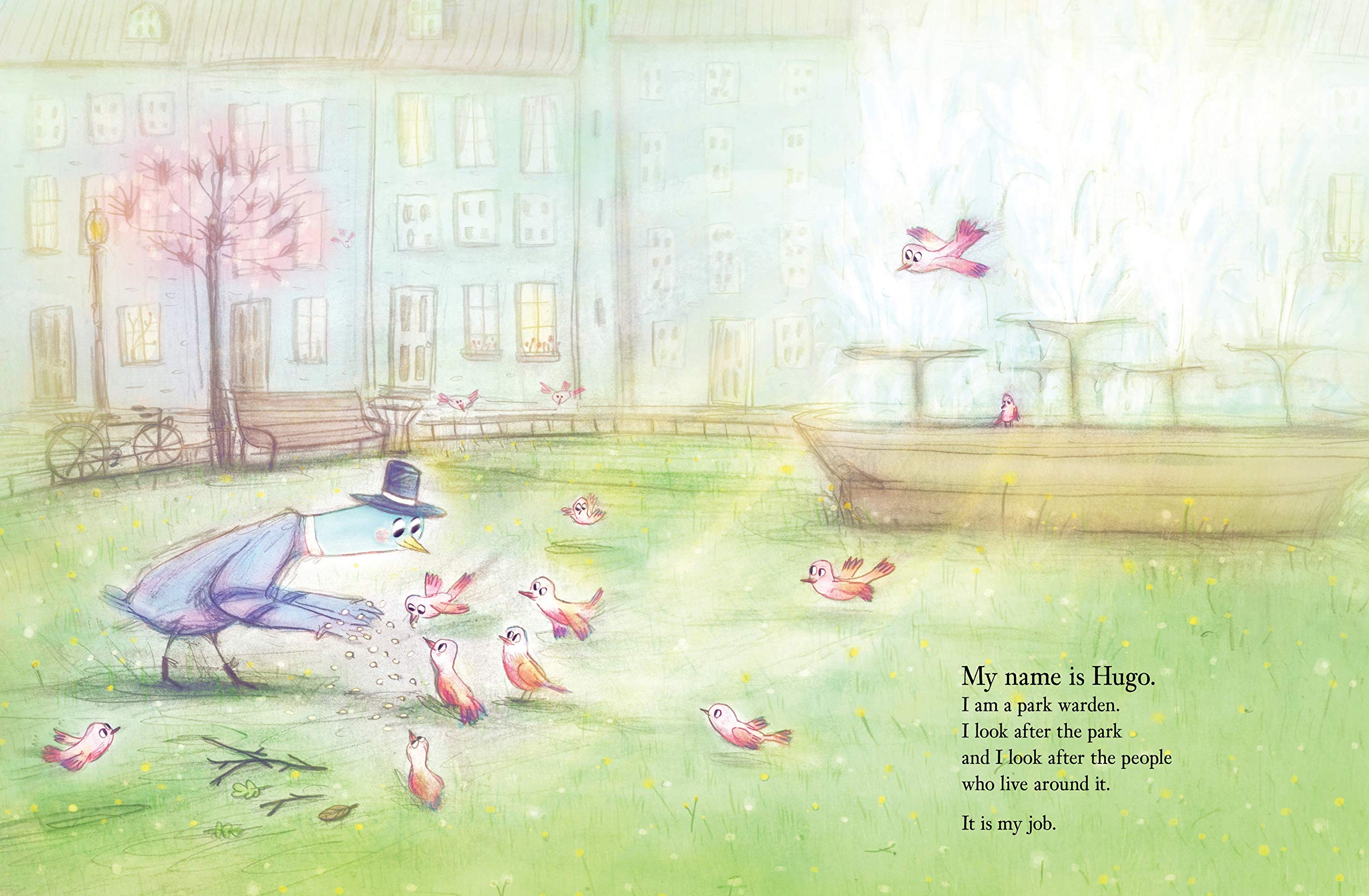 Hugo the pigeon has an important job. He looks after the park and everyone who lives there. Everyone except for the Somebody whose curtains are never open. But one day, Hugo is so busy doing his showing-off dance that he doesn't see the dog approaching ... and Somebody has to fly to the rescue!