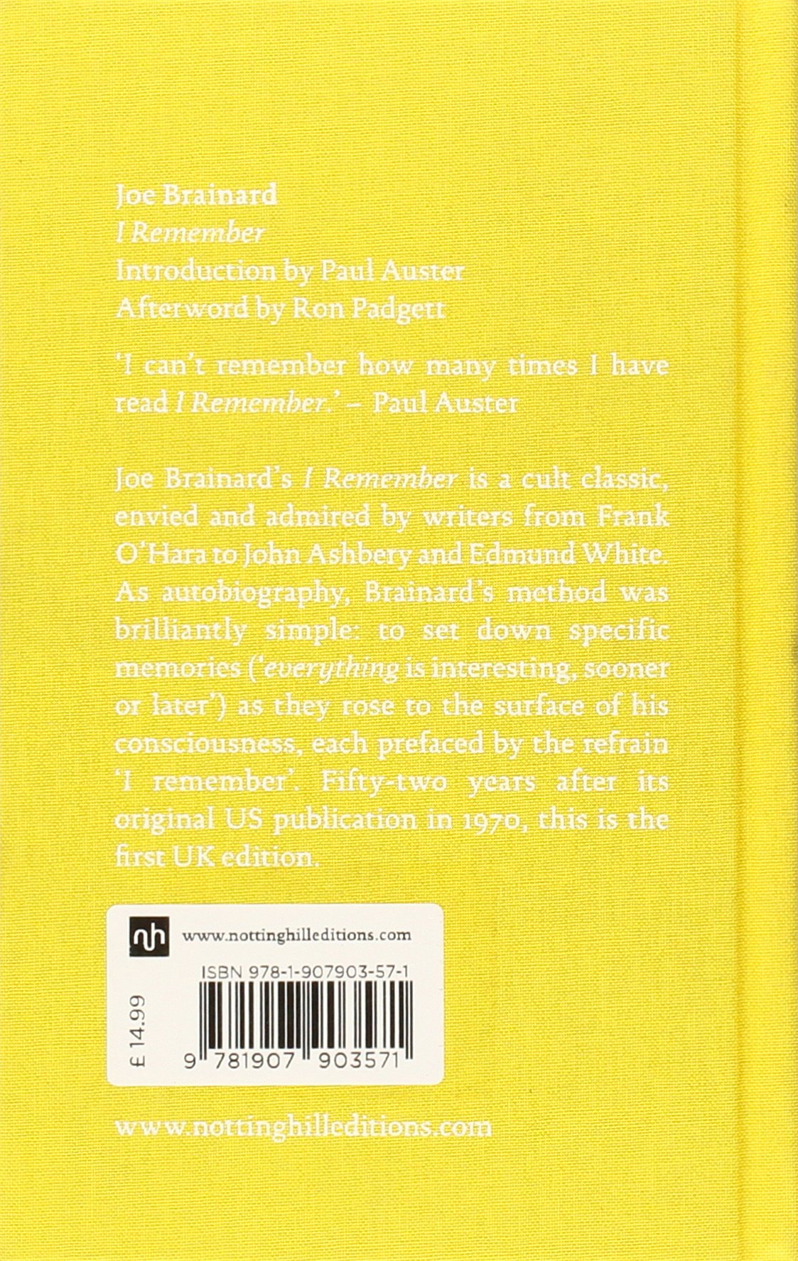 Joe Brainard's I Remember is a cult classic, envied and admired by writers from Frank O'Hara to John Ashbery and Edmund White. As autobiography, Brainard's method was brilliantly simple: to set down specific memories as they rose to the surface of his consciousness, each prefaced by the refrain 'I remember'. Fifty-two years after its original US publication in 1970, this is the first UK edition. 'In simple, forthright, declarative sentences, he charts the map of the human soul and permanently alters the way we look at the world. I Remember is both uproariously funny and deeply moving. It is also one of the few totally original books I have ever read.' Paul Auster 'I would make a case for I Remember as one of the twenty or so most important American autobiographies, important for its air of unimportance and for its mingling of cultural bric-a-brac with sexual frankness and self-revelation.' New Yorker