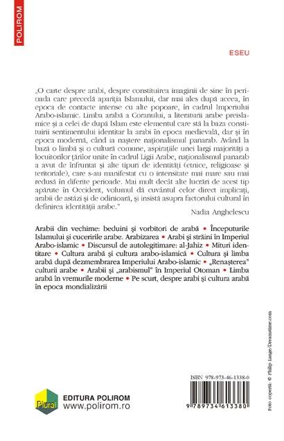Volumul urmareste felul in care se configureaza sentimentul identitatii arabe, de la aparitia Islamului pina in epoca moderna, in conditiile eliberarii de sub stapinirea Imperiului Otoman, iar apoi a puterilor occidentale. Lucrarea abordeaza coordonatele fundamentale ale culturii si vietii arabe: istorie si civilizatie, limba si cultura, literatura si imagologie, de la discursul de autolegitimare al lui al-Jahiz pina in zilele noastre, cind organizatiile de prestigiu (cum ar fi Liga Araba) fac eforturi considerabile pentru reintregirea unitatii limbii si culturii arabe.
