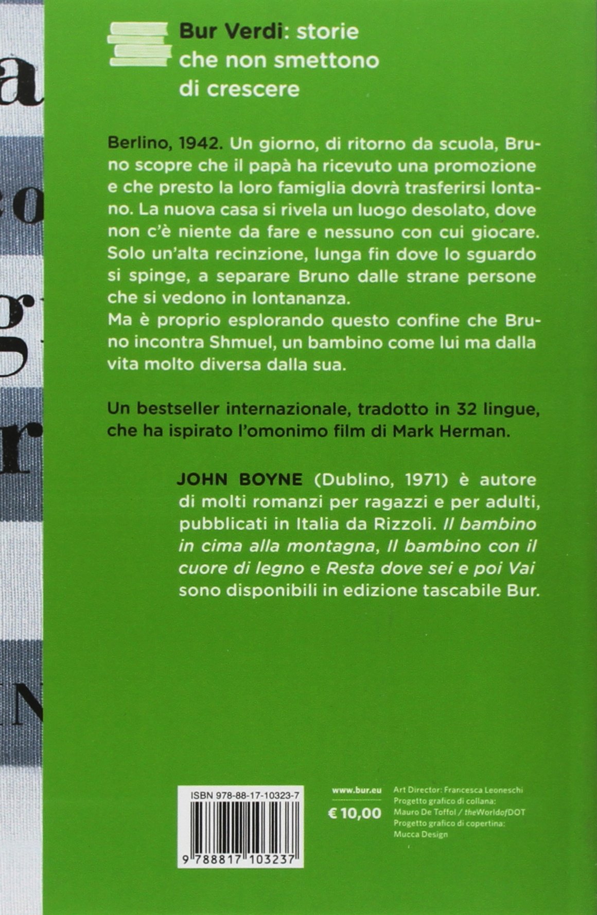 Leggere questo libro significa fare un viaggio. Prendere per mano, o meglio farsi prendere per mano da Bruno, un bambino di nove anni, e cominciare a camminare. Presto o tardi si arriverà davanti a un recinto. Uno di quei recinti che esistono in tutto il mondo, uno di quelli che ci si augura di non dover mai varcare. Siamo nel 1942 e il padre di Bruno è il comandante di un campo di sterminio. Non sarà dunque difficile comprendere che cosa sia questo recinto di rete metallica, oltre il quale si vede una costruzione in mattoni rossi sormontata da un altissimo camino. Ma sarà amaro e doloroso, com'è doloroso e necessario accompagnare Bruno fino a quel recinto, fino alla sua amicizia con Shmuel, un bambino polacco che sta dall'altro lato della rete, nel recinto, prigioniero. John Boyne ci consegna una storia che dimostra meglio di qualsiasi spiegazione teorica come in una guerra tutti sono vittime, e tra loro quelli a cui viene sempre negata la parola sono proprio i bambini. Prefazione di Giuseppe Catozzella.