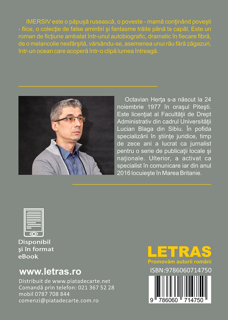 ,,Imersiv” poate fi inteles si ca o carte autobiografica (desi contine o multitudine de aspecte fictive, de la nume de personaje pana la intamplari care nu s-au petrecut niciodata, cel putin nu in realitatea conventionala), urmarind, pe mai multe paliere narative, povestea unei familii obisnuite din Pitestiul anilor ’80, in care autorul devine, rand pe rand, observator si personaj, dezvaluind si incifrand in acelasi timp elementele care descompun si recompun propria-i existenta, dar si pe cele ale mamei, tatalui, fratelui ori bunicilor.