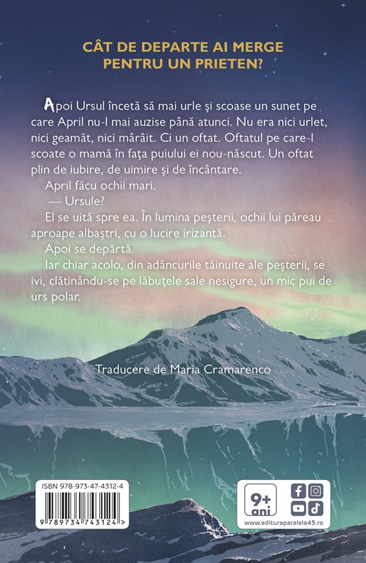 Când o veste tulburătoare ajunge la urechile ei – un urs polar a fost împușcat și rănit în Svalbard –, April simte că trebuie să fie el și îl înduplecă pe tatăl ei să pornească împreună într-o expediție spre cele mai izolate tărâmuri arctice. Așa începe o călătorie de neuitat peste tundra înghețată, printre ghețarii orbitori. Dar destinul îi scoate în cale un pui de urs polar plăpând, care are nevoie disperată de ajutorul ei. Ca să-l poată salva, April va trebui să-și înfrunte cele mai mari temeri.
