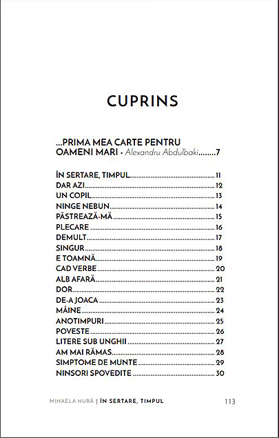 Volumul de fata este o oglindire, un tablou de familie pictat dintr-un balcon fara ferestre, intr-o ceasca de cafea. Intre paginile sale se regasesc nu doar temerile si emotiile unei singure femei minunate, ci el reprezinta o colectie de ganduri adunate de la oamenii ce au inconjurat-o la un moment dat. Sau poate chiar cate o bucata din fiecare inima. De aceea, as numi aceasta noua aventura a Mihaelei Hura un eveniment. Nu intr-atat sub aspect editorial, fiind al treilea titlu aparut cu numele domniei sale, ci pentru ca el reprezinta un sertar deschis. Aproape ca ai o responsabilitate atunci cand cotrobai prin intimitatea unui om care se chinuie sa-si fereasca privirea. Doamna Hura a demonstrat deja, prin intermediul celorlalte doua aparitii, ca are imaginatia, pregatirea si talentul pentru scris. [...]