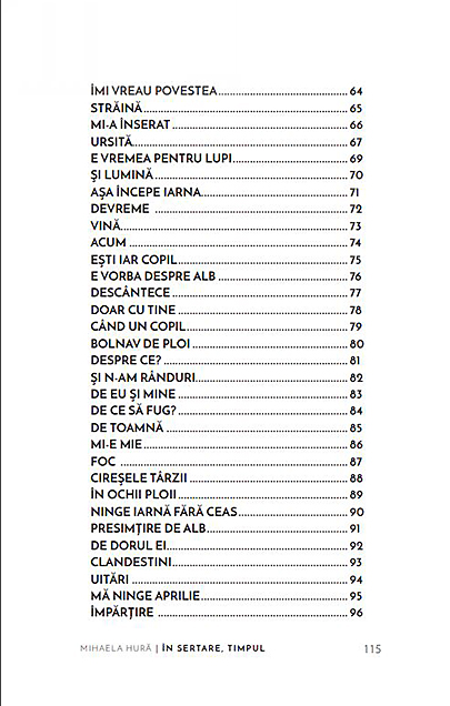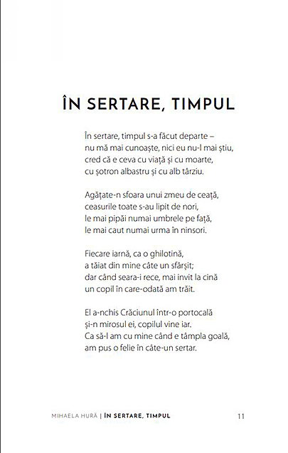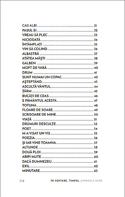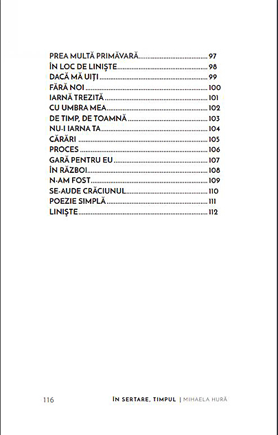 Sertarele Mihaelei inchid orizontul unei lumi in care fosnetul plopilor se aude precum valurile marii. E suficient sa inchizi ochii. Gandurile ei cenusii se prezinta lumii adesea invesmantate intr-un albastru deghizat, precum dansul unui arlechin suferind. Mihaela nu minte in arta ei. Se destainuie. Insa, dintr-un respect magulitor pentru cel ce o citeste, imbraca in straie de sarbatoare fiecare gand. Chiar si acela care doare. Onestitatea ei, pereche cu eleganta stilistica, da culoare unui univers paralel, in care paseste emotionata si curioasa. Nu e o lume ideala. Doar alta. In care sa te ascunzi uneori ca sa te odihnesti.