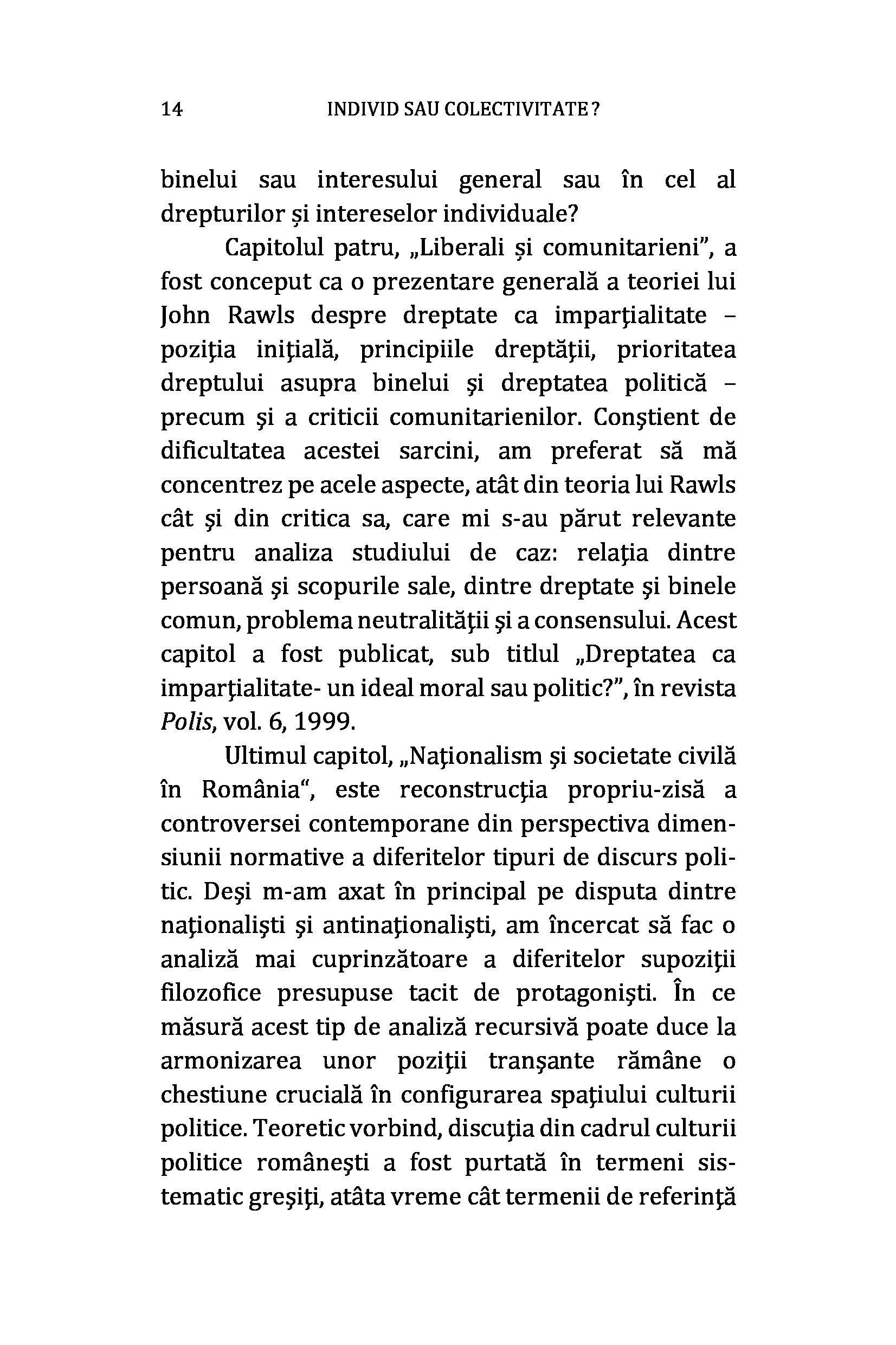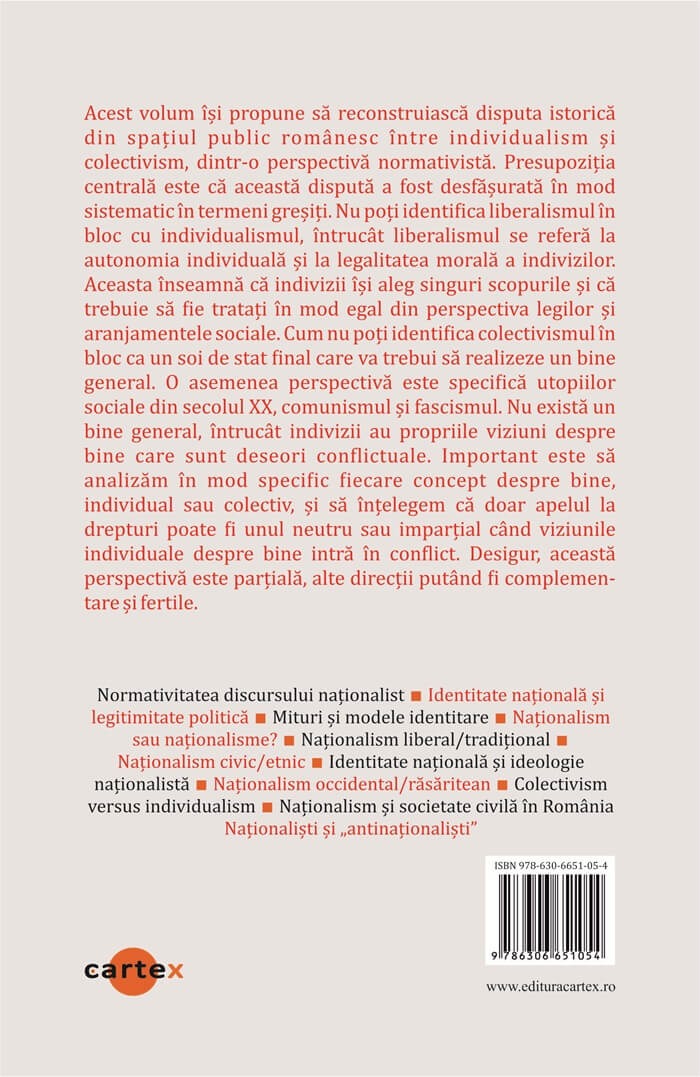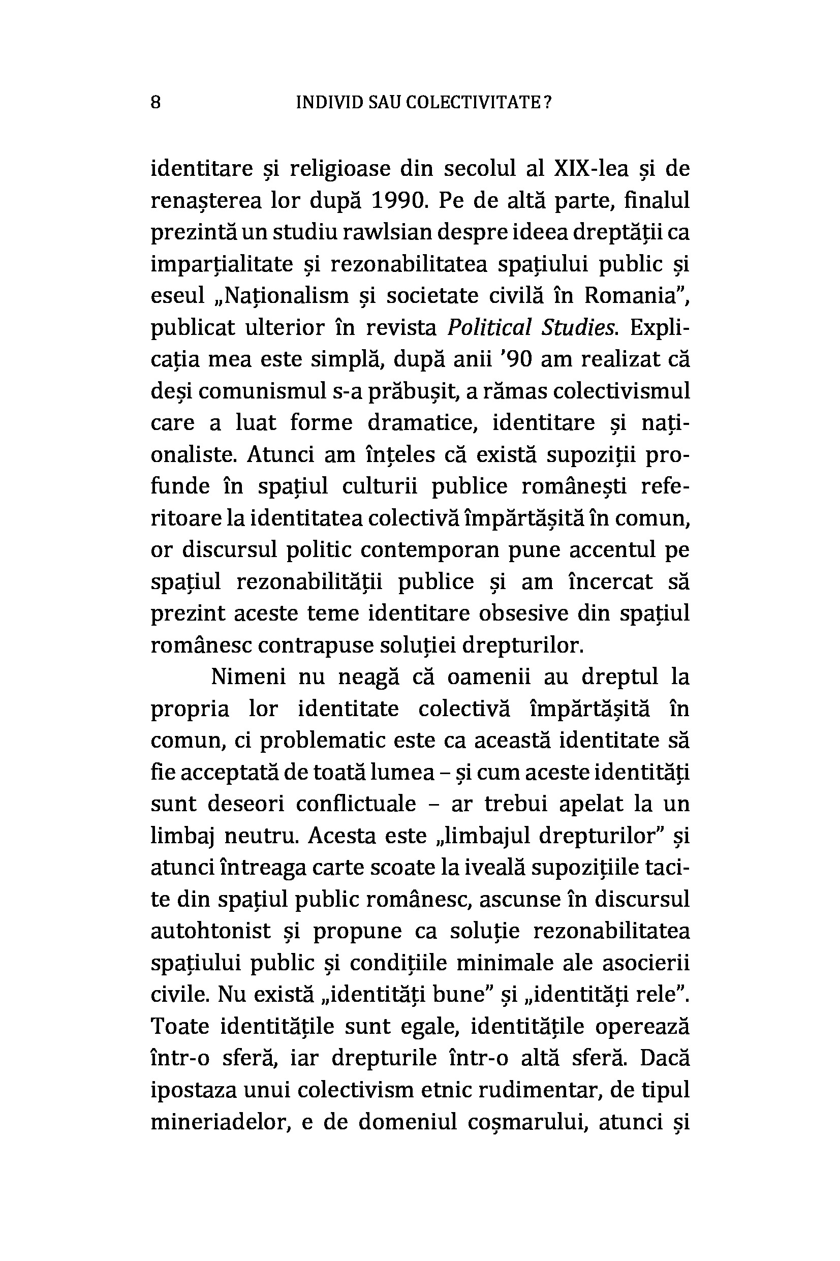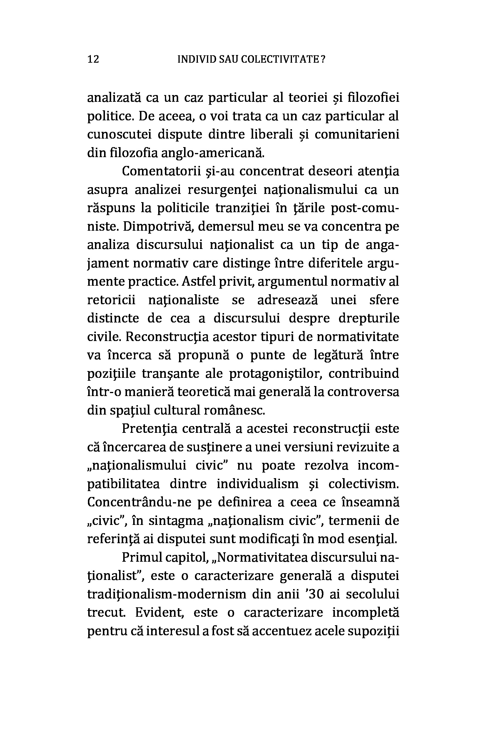 Acest volum isi propune sa reconstruiasca disputa istorica din spatiul public romanesc intre individualism si colectivism, dintr-o perspectiva normativista. Presupozitia centrala este ca aceasta disputa a fost desfasurata in mod sistematic in termeni gresiti. Nu poti identifica liberalismul in bloc cu individualismul, intrucat liberalismul se refera la autonomia individuala si la legalitatea morala a indivizilor.