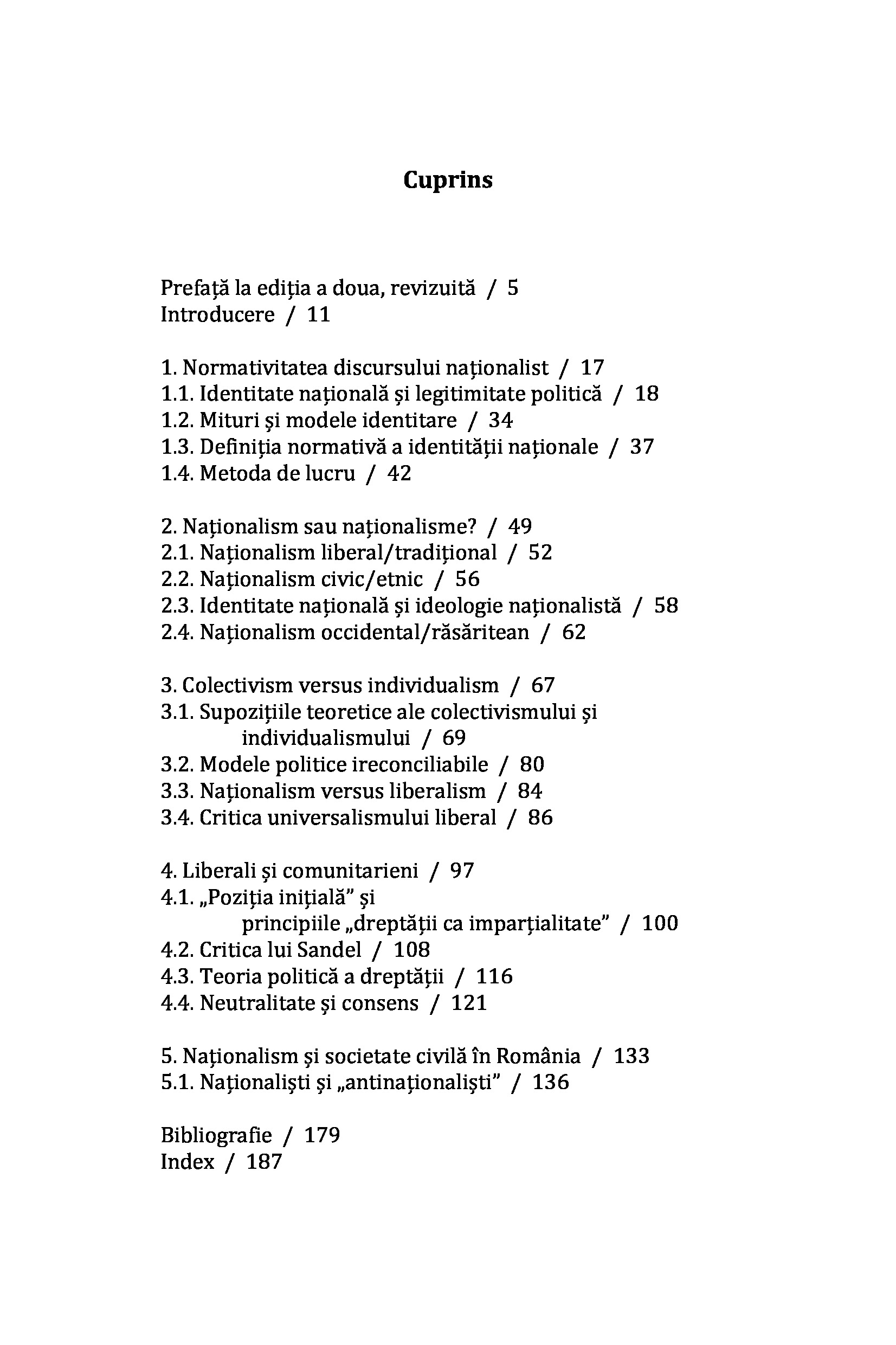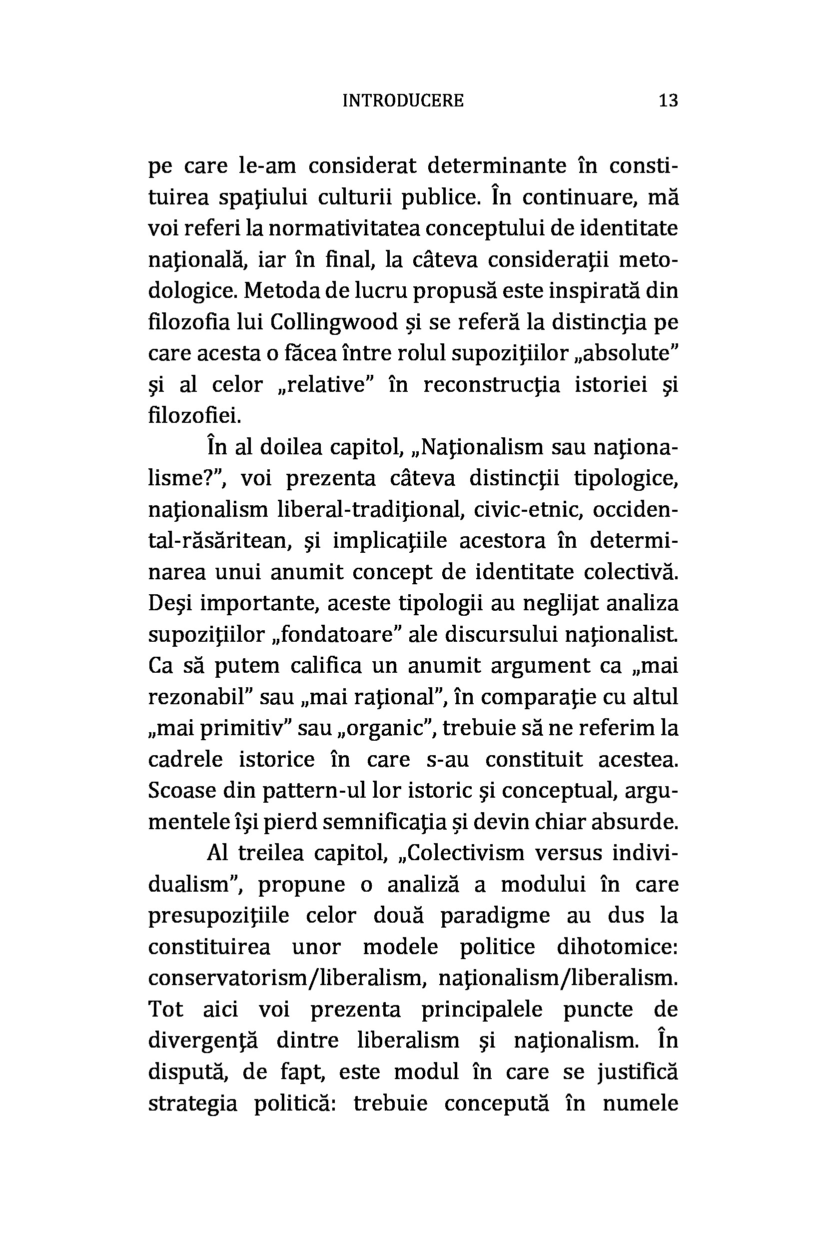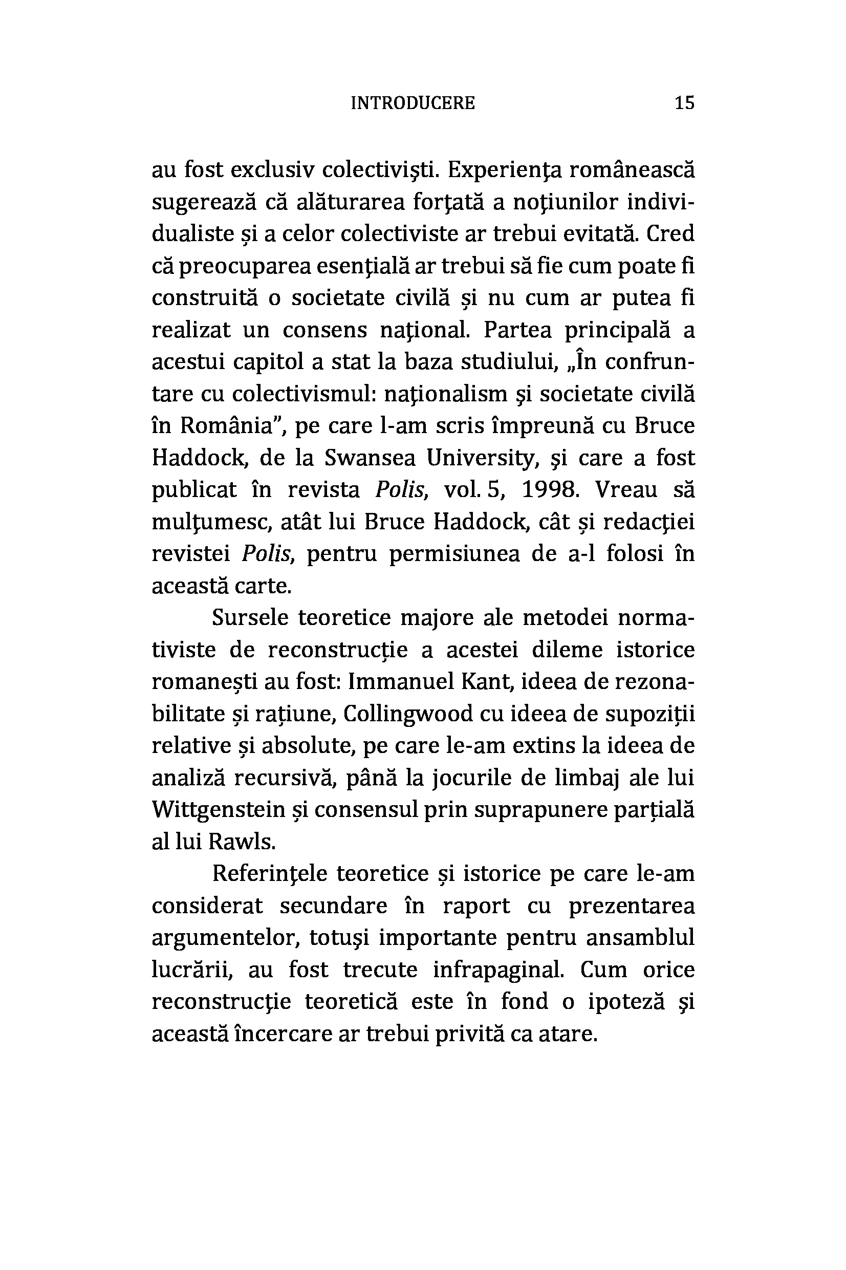 Acest volum isi propune sa reconstruiasca disputa istorica din spatiul public romanesc intre individualism si colectivism, dintr-o perspectiva normativista. Presupozitia centrala este ca aceasta disputa a fost desfasurata in mod sistematic in termeni gresiti. Nu poti identifica liberalismul in bloc cu individualismul, intrucat liberalismul se refera la autonomia individuala si la legalitatea morala a indivizilor.