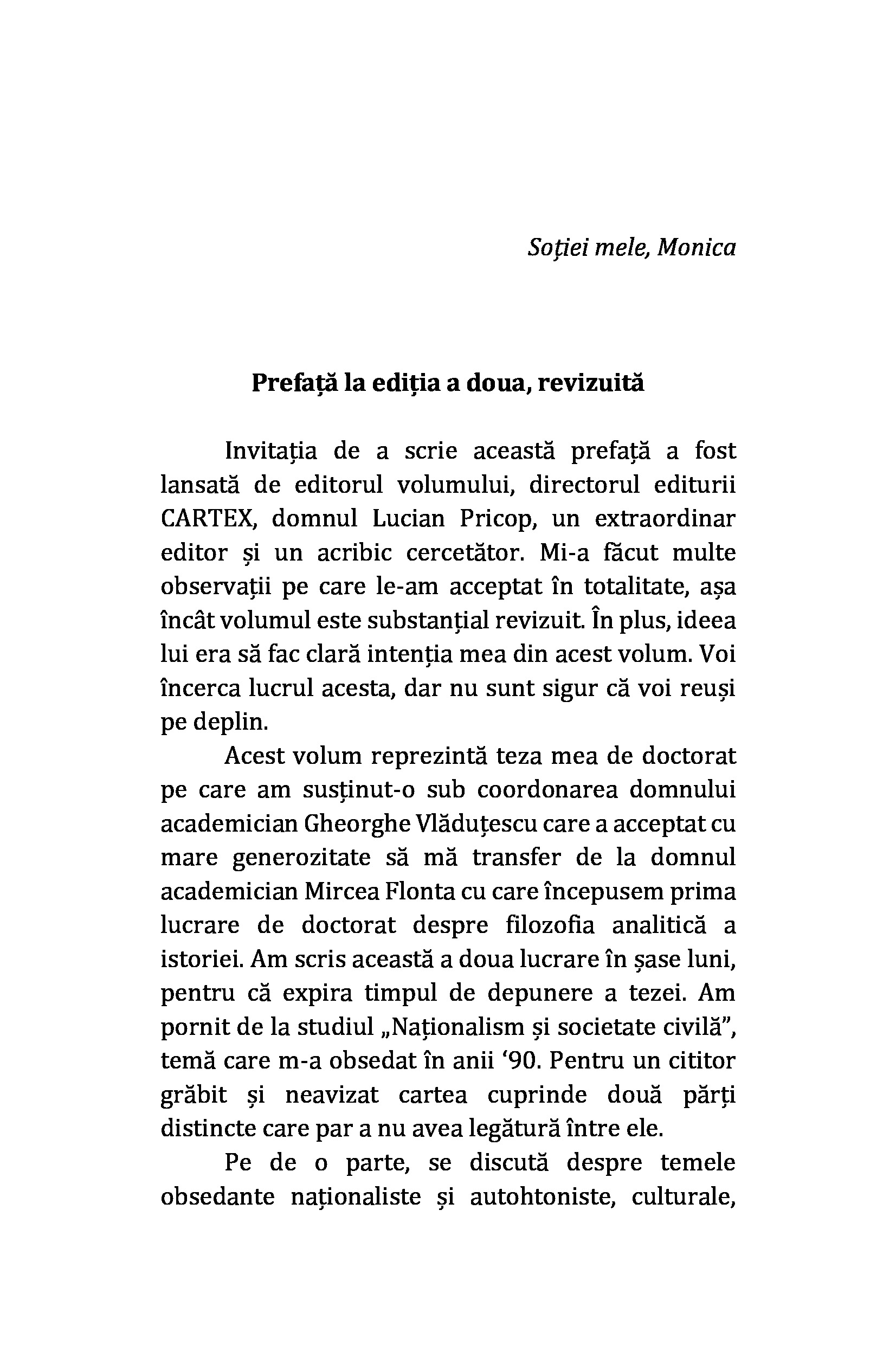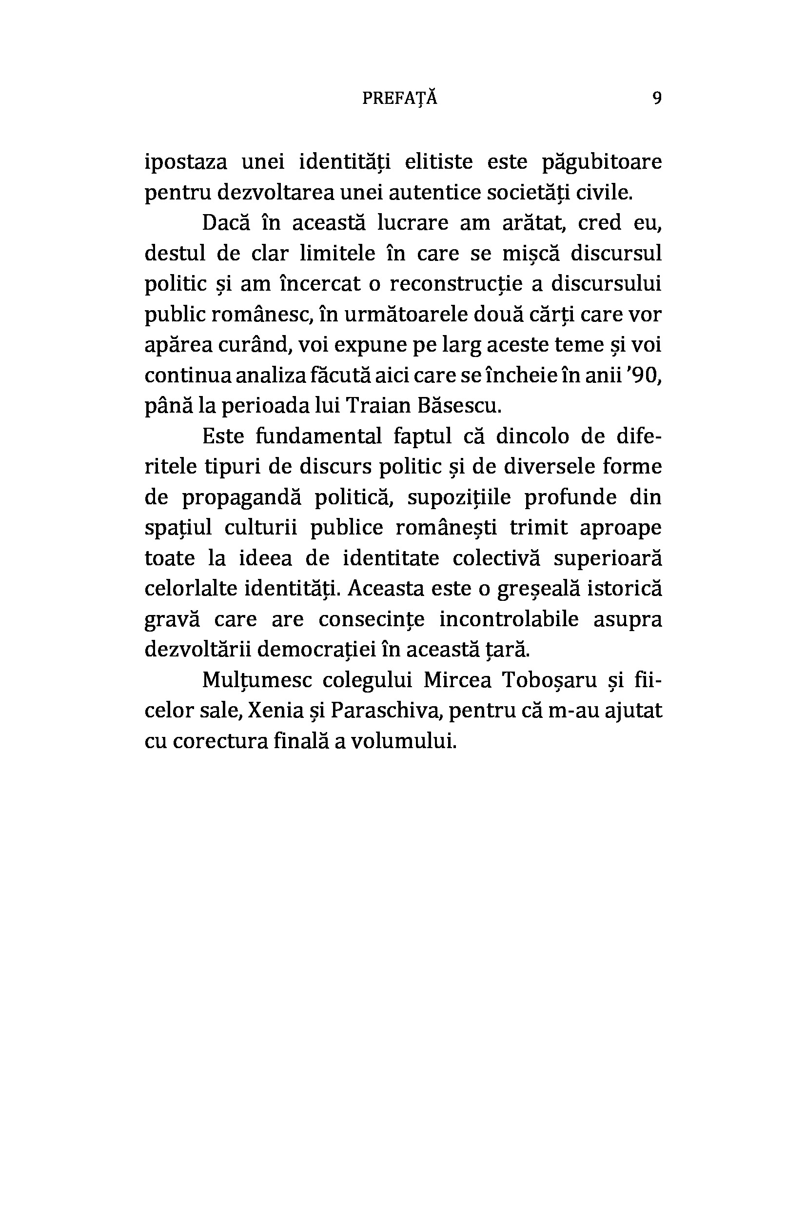 Aceasta carte a fost conceputa ca o analiza (si reconstructie) a diferitelor supozitii teoretice ale controversei politice, aparute dupa 1989, legata de problemele identitatii, legitimitatii si societatii civile in Romania.