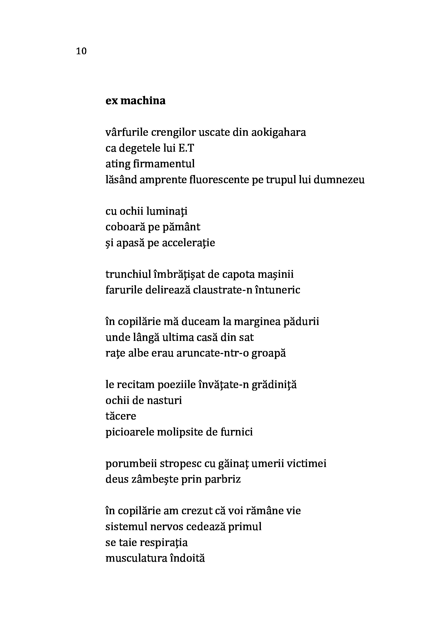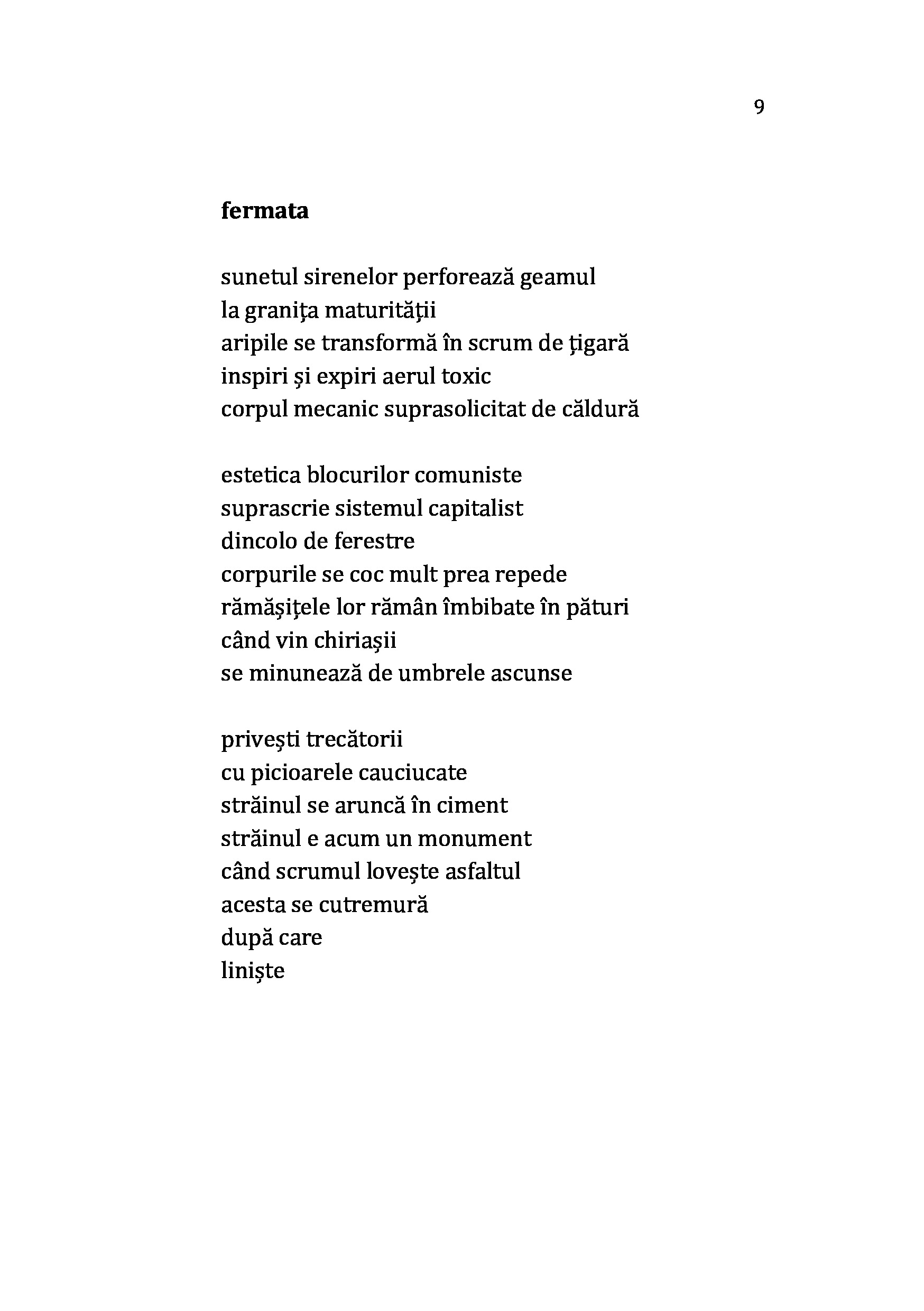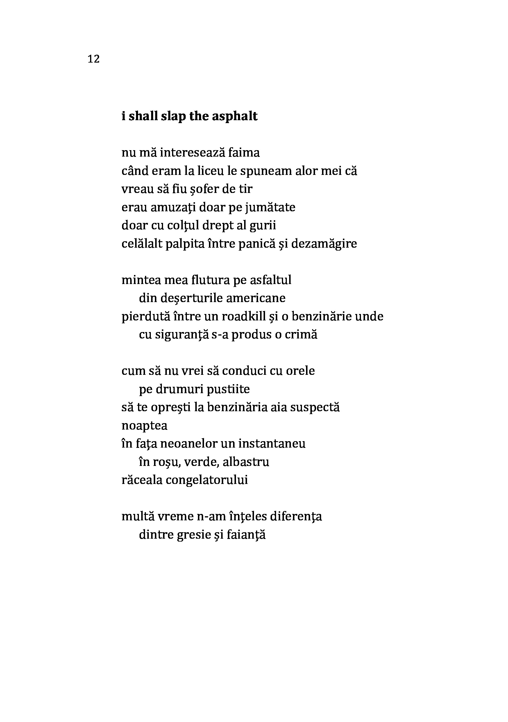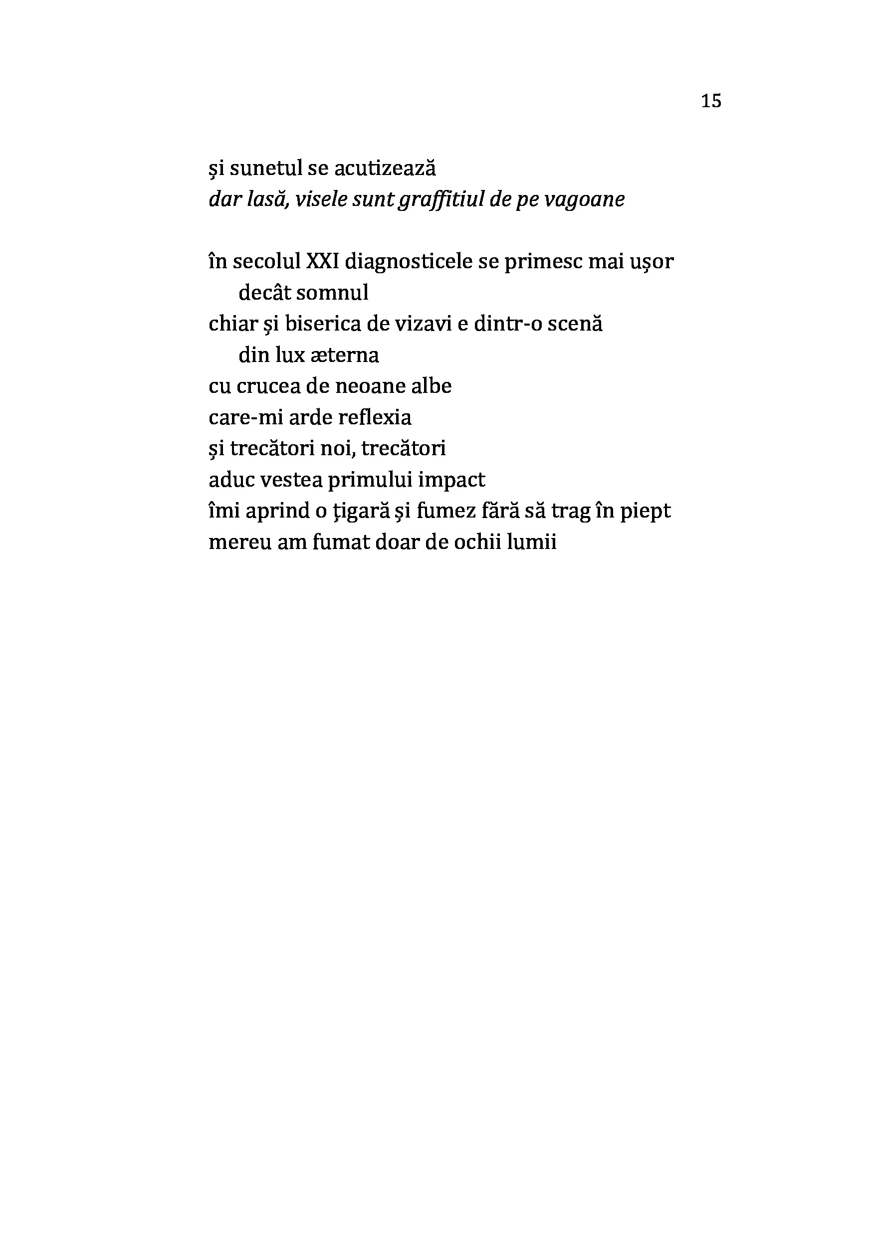 Pattern-ul este cel al unui roller coaster ca o banda lui Möbius: diferentele de altitudine emotionala, aerul uneori prea dens, alteori rarefiat pana la asfixie, alternanta real-imaginar sau real-distopic, calmul prea bine regizat ca sa fie adevarat si capabil sa ascunda turbionul aflat deasupra sau dedesubt, aparenta unei normalitati nelinistitoare, asadar aprehensiunea inexplicabila care te insoteste in tot acest excurs periculos ca o lama de katana, ei bine, toate astea iti dau iluzia ca exista un capat, un final, o debarcare din vehicolul poetic capabila sa te trezeasca la realitate asa cum se intampla dupa ce-ti dai ochelarii speciali jos si iesi brusc din lumea 3D a unei proiectii cinematografice. Totusi, constati ca ceva nu se potriveste, ca unele lucruri ies din sfera obisnuitului. Ceva s-a modificat in structura ta interioara, perceptia e ultrasensibilizata, acuitatea vederii e in punctul maxim.