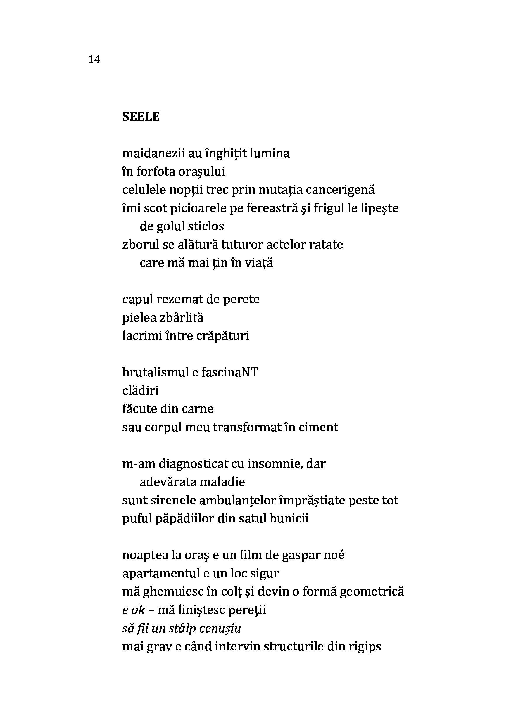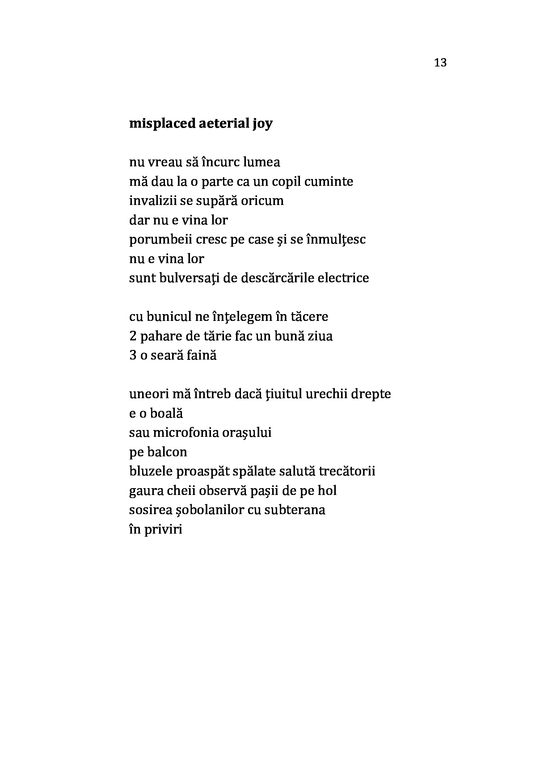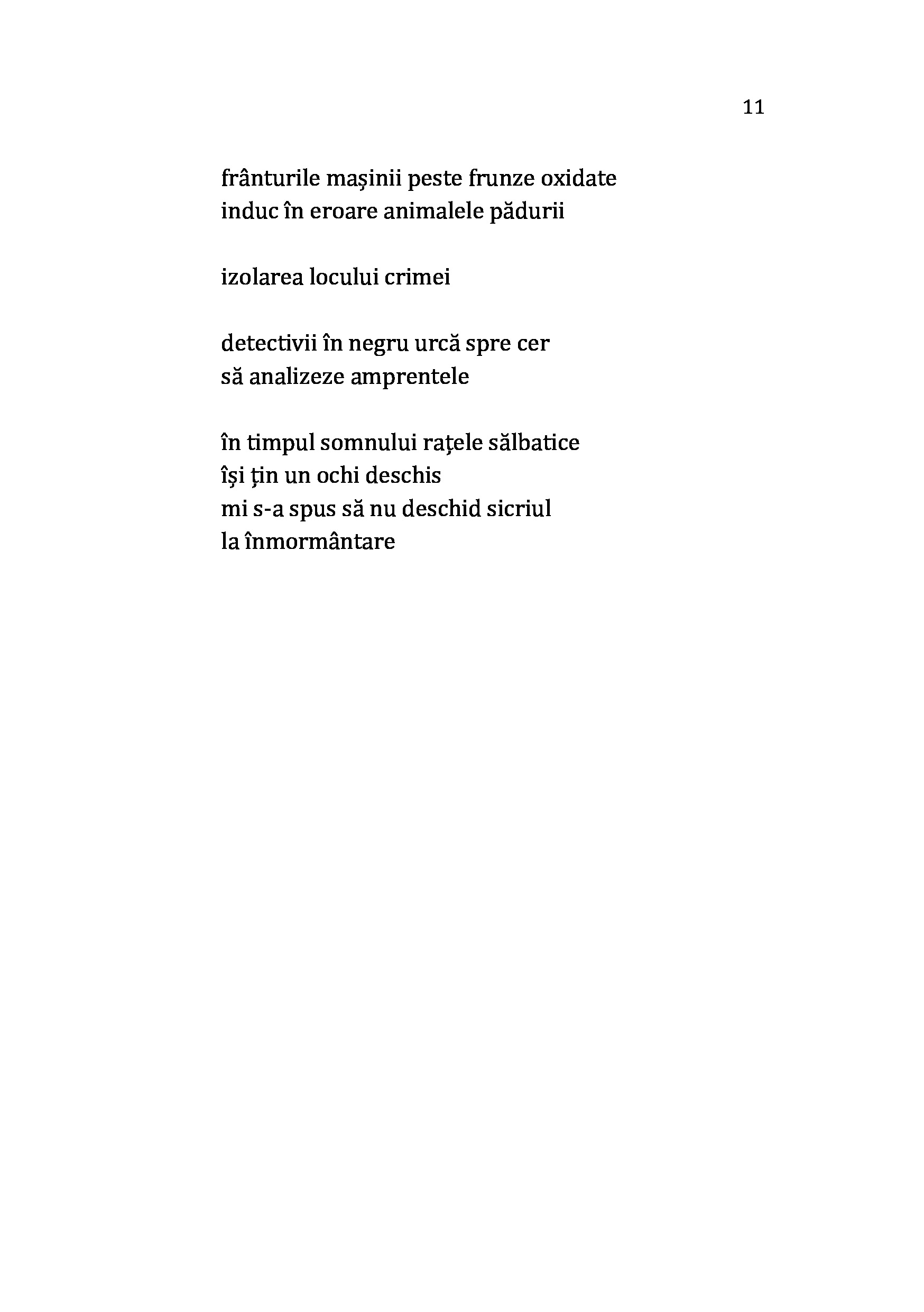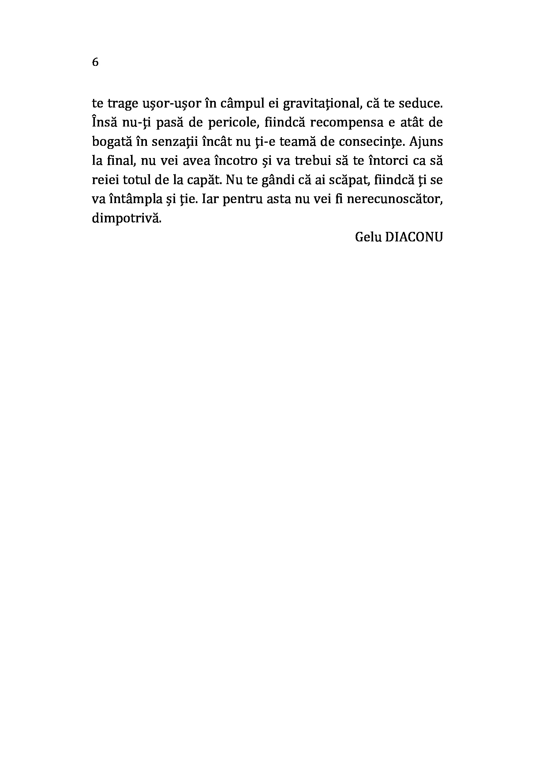 Pattern-ul este cel al unui roller coaster ca o banda lui Möbius: diferentele de altitudine emotionala, aerul uneori prea dens, alteori rarefiat pana la asfixie, alternanta real-imaginar sau real-distopic, calmul prea bine regizat ca sa fie adevarat si capabil sa ascunda turbionul aflat deasupra sau dedesubt, aparenta unei normalitati nelinistitoare, asadar aprehensiunea inexplicabila care te insoteste in tot acest excurs periculos ca o lama de katana, ei bine, toate astea iti dau iluzia ca exista un capat, un final, o debarcare din vehicolul poetic capabila sa te trezeasca la realitate asa cum se intampla dupa ce-ti dai ochelarii speciali jos si iesi brusc din lumea 3D a unei proiectii cinematografice. Totusi, constati ca ceva nu se potriveste, ca unele lucruri ies din sfera obisnuitului. Ceva s-a modificat in structura ta interioara, perceptia e ultrasensibilizata, acuitatea vederii e in punctul maxim.