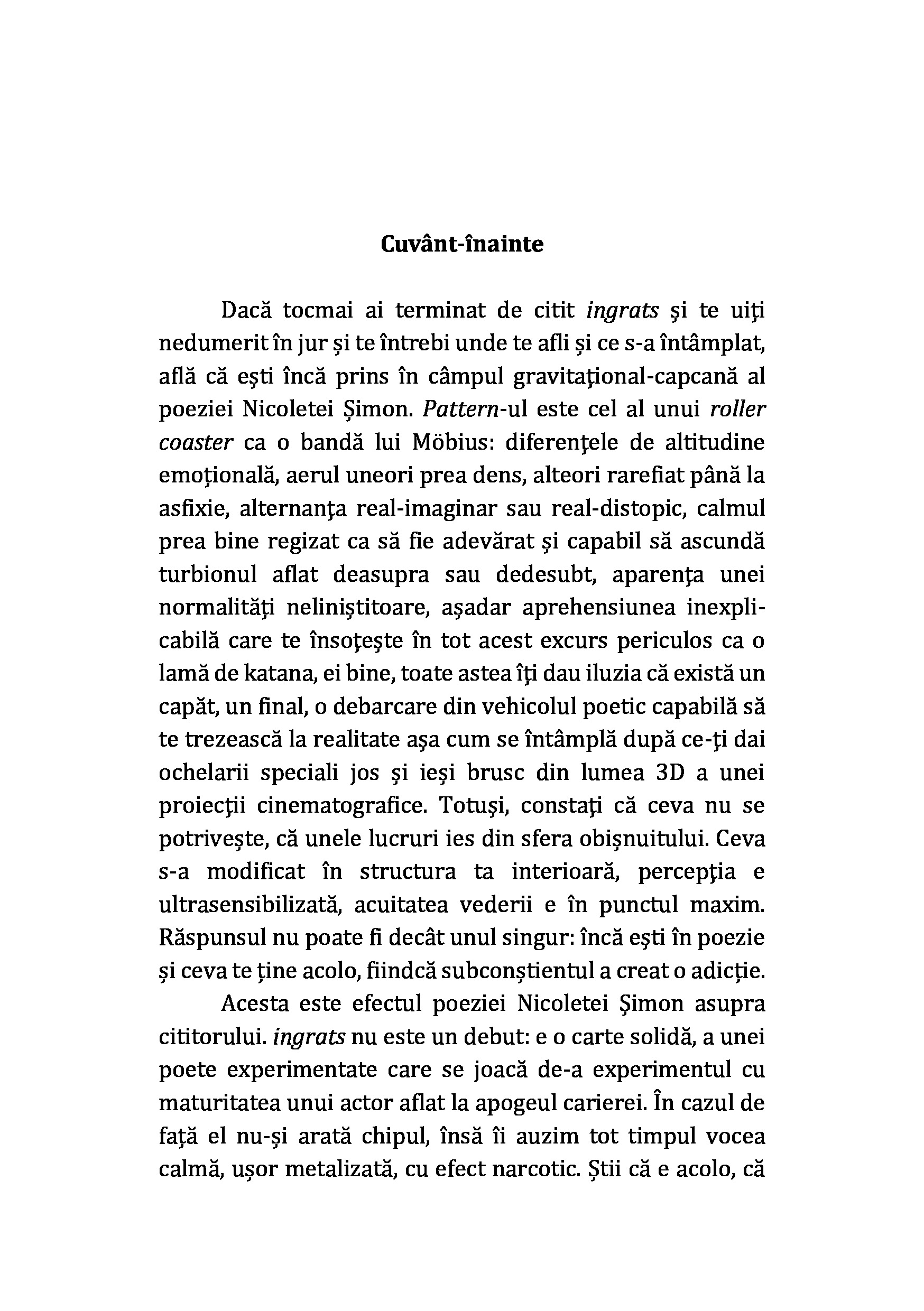 Raspunsul nu poate fi decat unul singur: inca esti in poezie si ceva te tine acolo, fiindca subconstientul a creat o adictie. Acesta este efectul poeziei Nicoletei Simon asupra cititorului. (ingrats) nu este un debut: e o carte solida, a unei poete experimentate care se joaca de-a experimentul cu maturitatea unui actor aflat la apogeul carierei. In cazul de fata el nu-si arata chipul, insa ii auzim tot timpul vocea calma, usor metalizata, cu efect narcotic. Stii ca e acolo, ca te trage usor-usor in campul ei gravitational, ca te seduce. Insa nu-ti pasa de pericole, fiindca recompensa e atat de bogata in senzatii incat nu ti-e teama de consecinte. Ajuns la final, nu vei avea incotro si va trebui sa te intorci ca sa reiei totul de la capat. Nu te gandi ca ai scapat, fiindca ti se va intampla si tie. Iar pentru asta nu vei fi nerecunoscator, dimpotriva. (Gelu DIACONU)