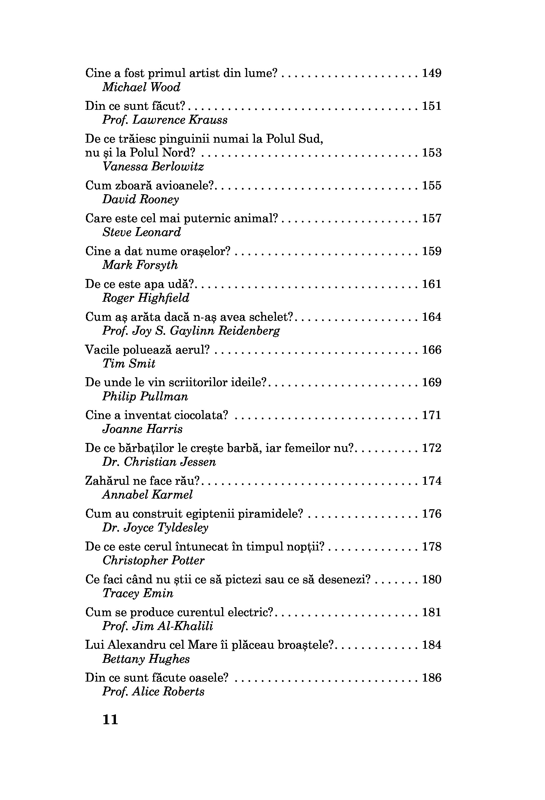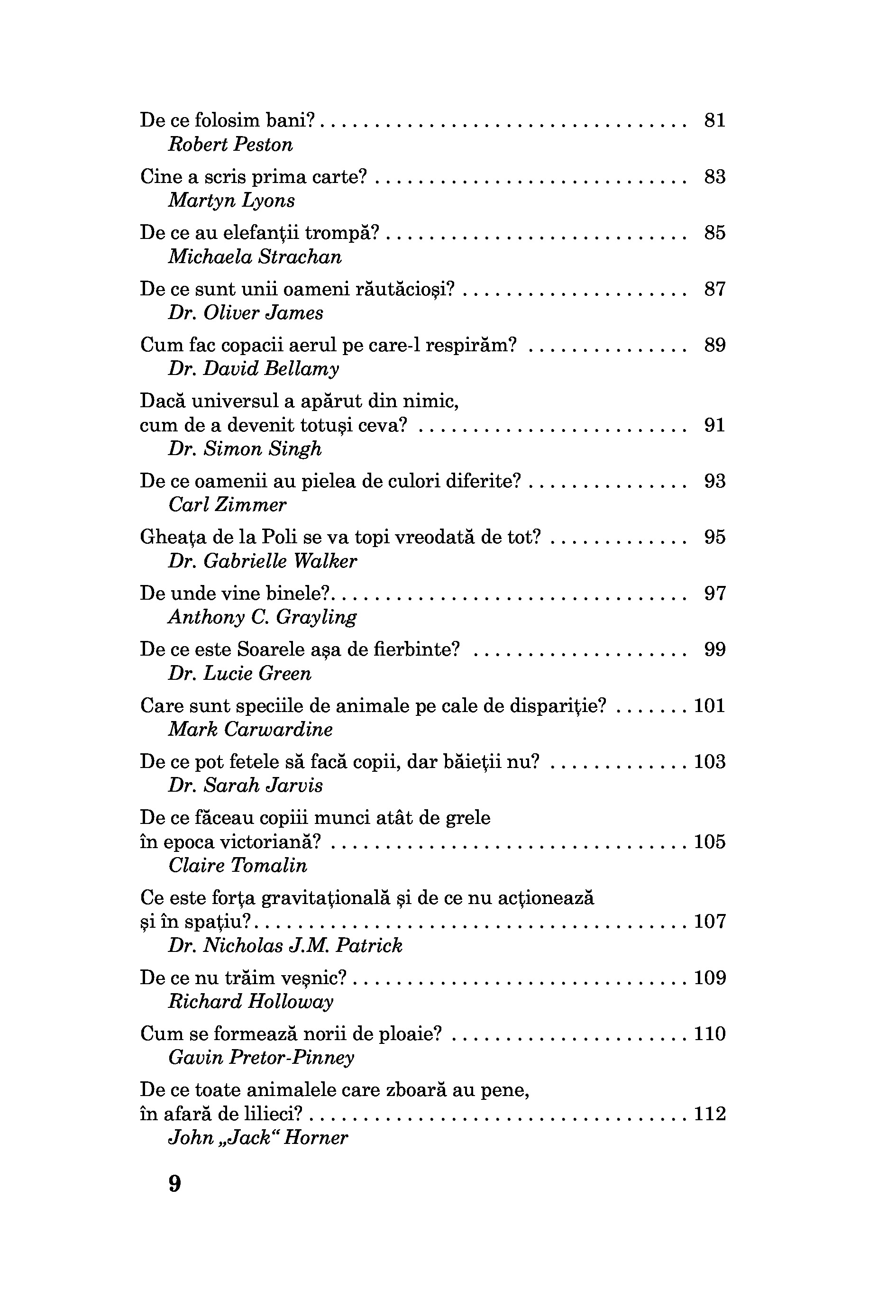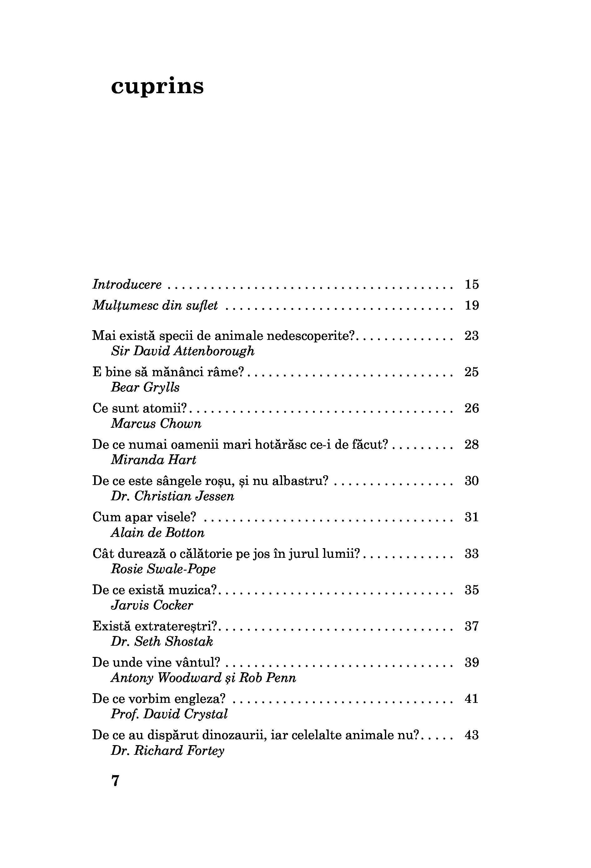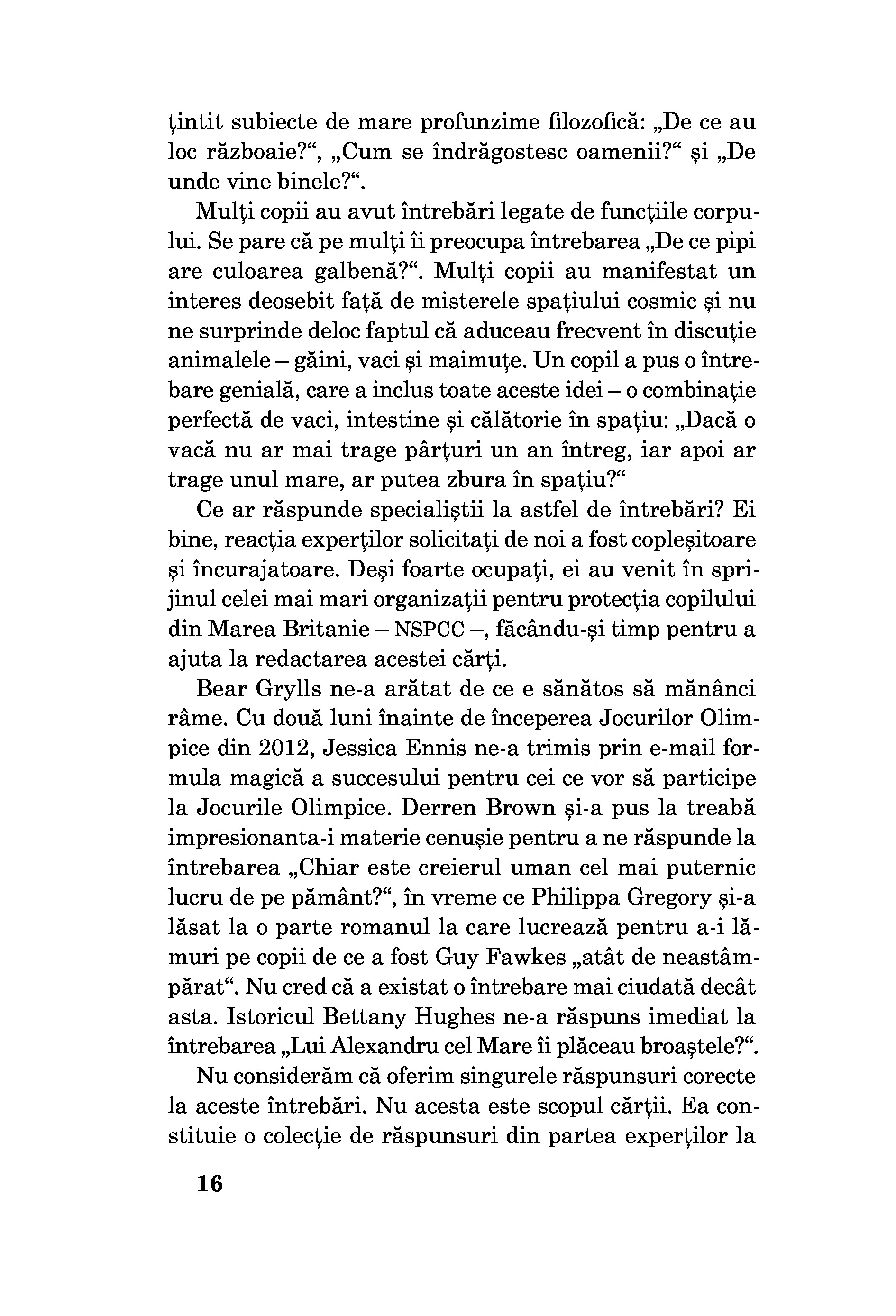 Această carte este o colecţie de peste o sută de întrebări trimise chiar de copii pentru a primi răspunsuri din partea unor specialişti cunoscuţi şi apreciaţi dintr-o mulţime de domenii: oameni de ştiinţă, scriitori, filozofi, vedete de televiziune, sportivi, muzicieni.