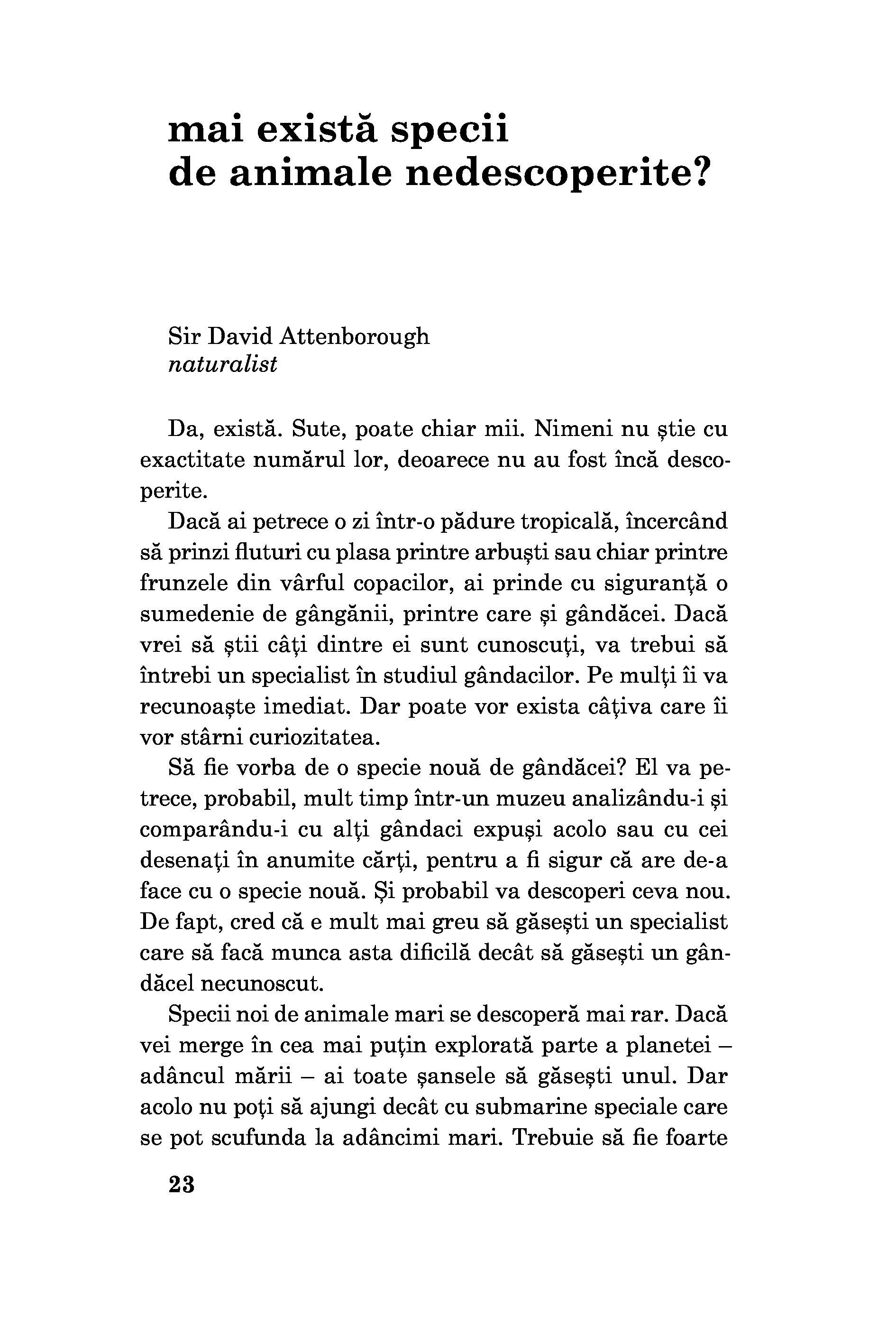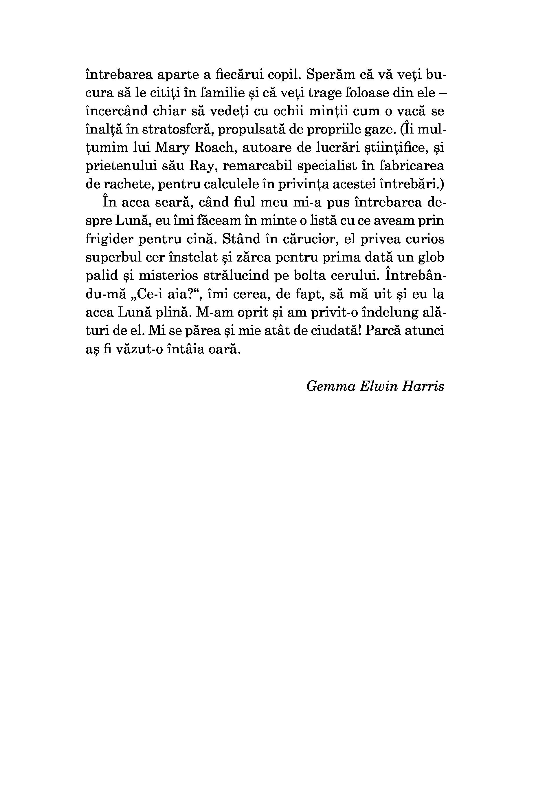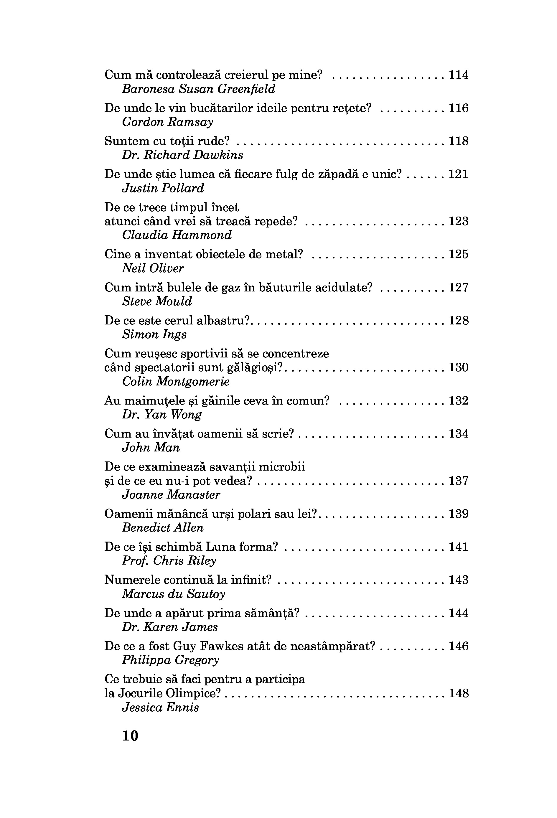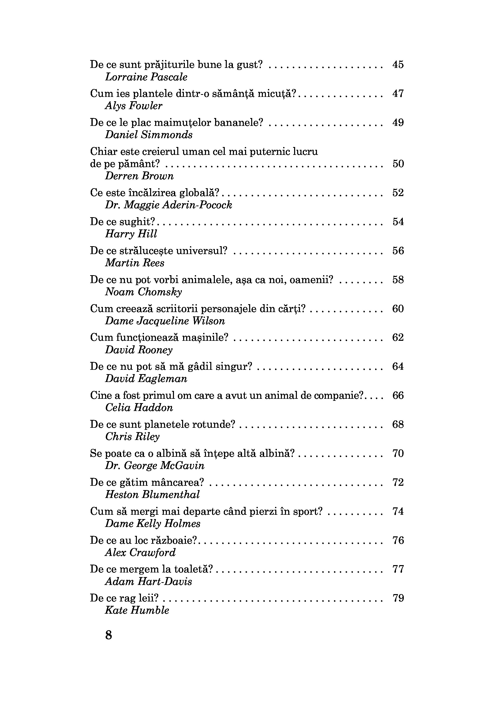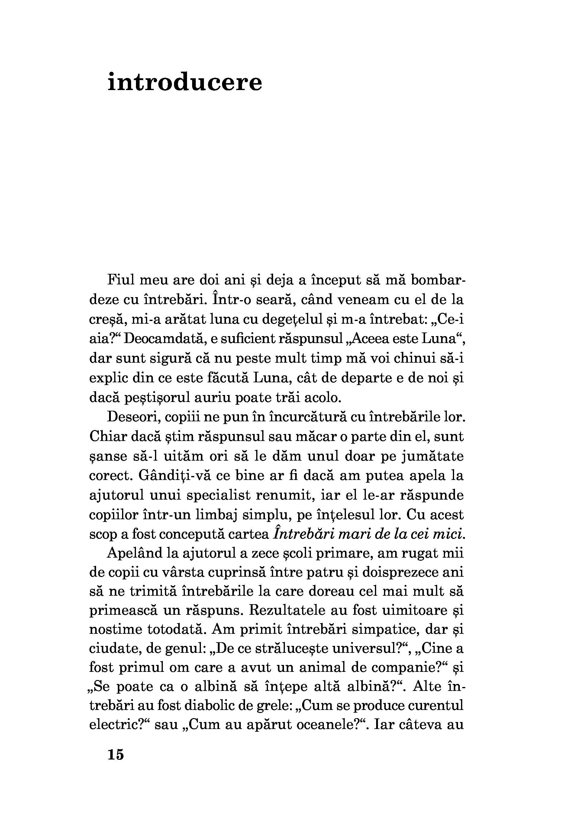 Această carte este o colecţie de peste o sută de întrebări trimise chiar de copii pentru a primi răspunsuri din partea unor specialişti cunoscuţi şi apreciaţi dintr-o mulţime de domenii: oameni de ştiinţă, scriitori, filozofi, vedete de televiziune, sportivi, muzicieni.