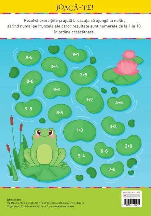 Rezolvă exercițiile și ajută broscuța să ajungă la nufăr, sărind numai pe frunzele ale căror rezultate sunt numerele de la 1 la 10, în ordine crescătoare.