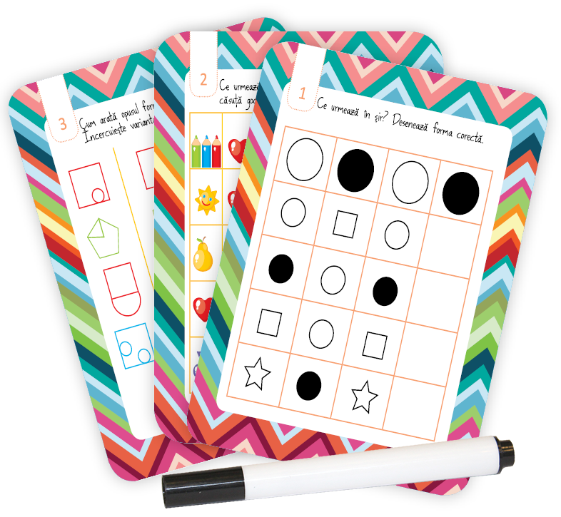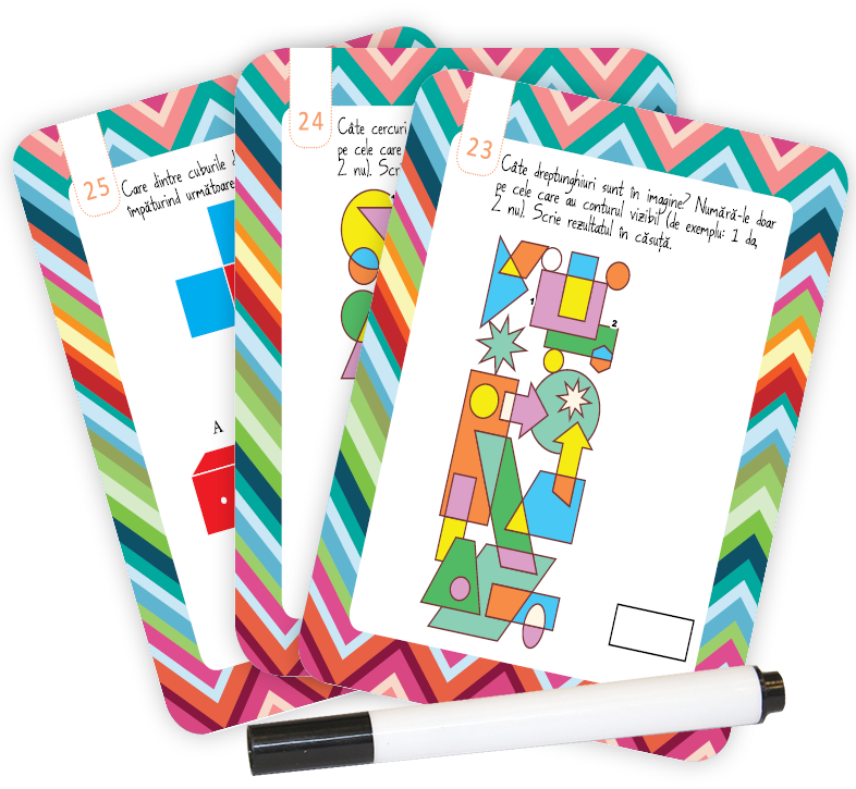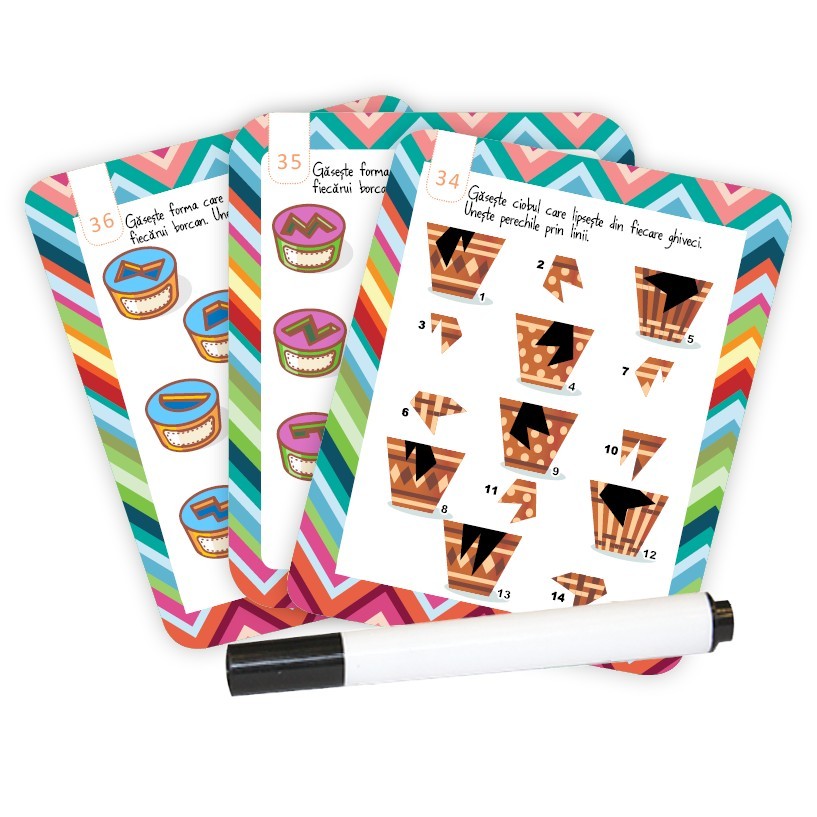 Pachetul IQ FUN - Logică geometrică conține fișe de lucru refolosibile cu diferite tipuri de puzzle-uri geometrice, de la recunoașterea și compunerea formelor până la identificarea suprafeței desfășurate a unui obiect tridimensional.