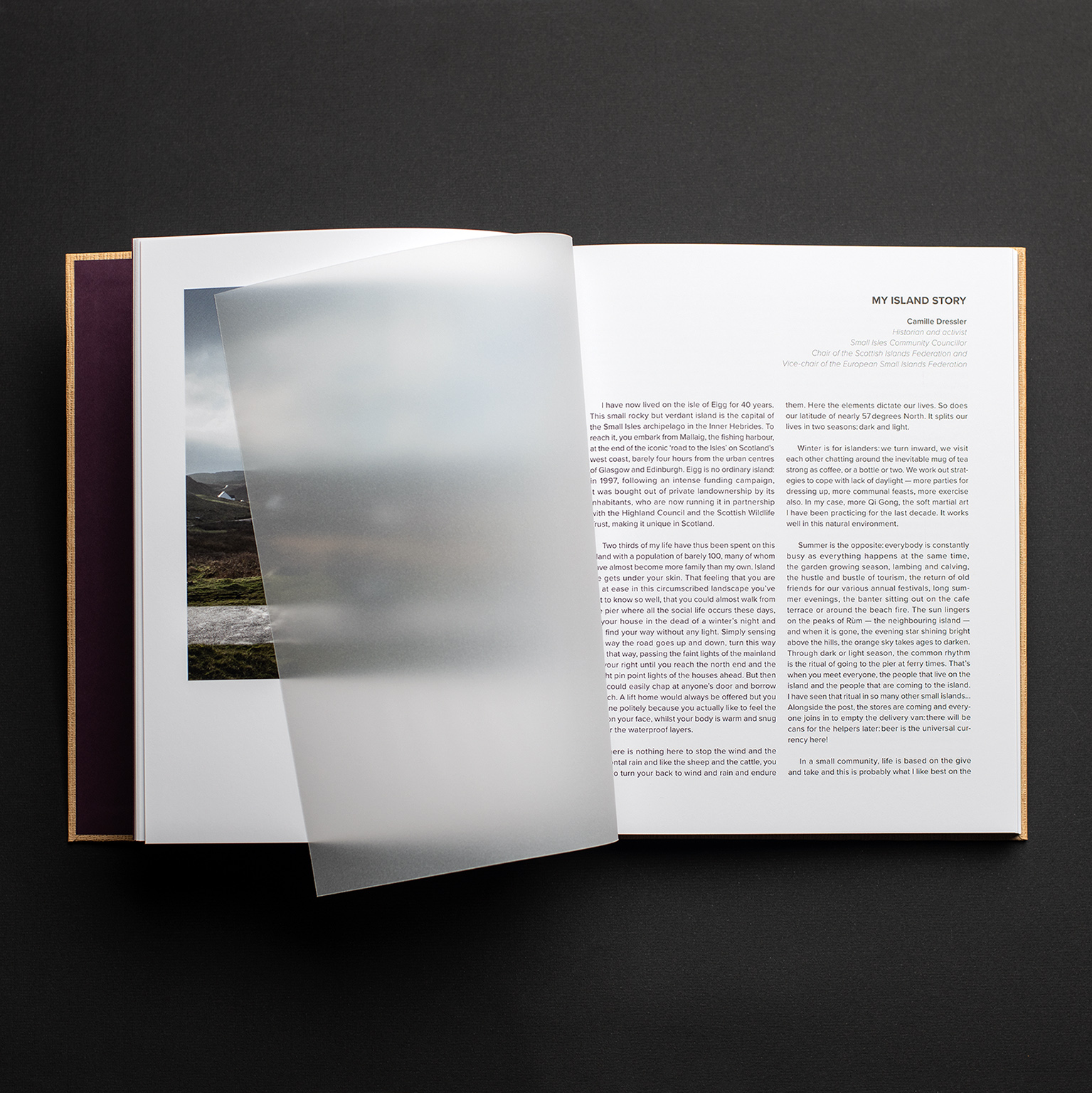 ISLE OF EIGG est un livre photographique qui reflète les sensations de Charles Delcourt. Soutenu par les habitants et particulièrement par Camille Dressler, historienne et auteur du texte, cet ouvrage devient en quelque sorte le passeport des îliens vers le continent.