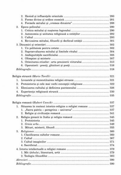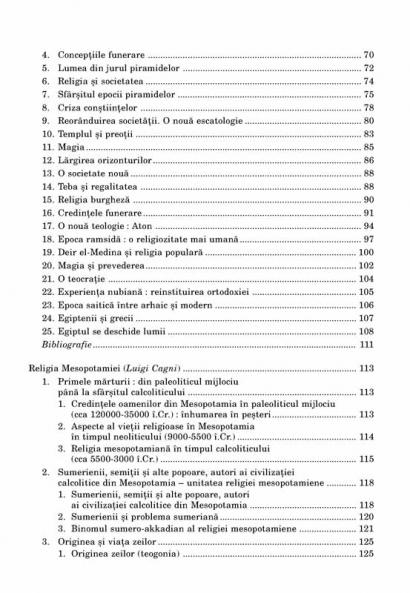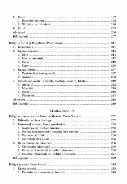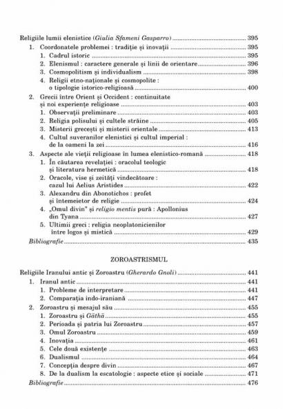 Am preferat sa recurgem la ordinea consacrata, care porneste de la prezentarea datelor pe care le detinem privind preistoria, parcurge intregul tablou al religiilor antice (vol. I), abordeaza cele trei religii abrahamice – iudaismul, crestinismul, islamul – (vol. II si III), pentru a trece apoi la tratarea religiilor Extremului Orient (vol. IV) si, in final, a religiilor popoarelor sub aspect etnologic (vol. V). Un statut aparte il au religiile dualiste – gnoza, maniheismul si destinul lor medieval –, pe care am decis sa le izolam dupa un criteriu tipologic (ele se gasesc in volumul al treilea doar din motive editoriale), si religiile din America precolumbiana, plasate din motive similare in ultimul volum.” (Giovanni Filoramo)