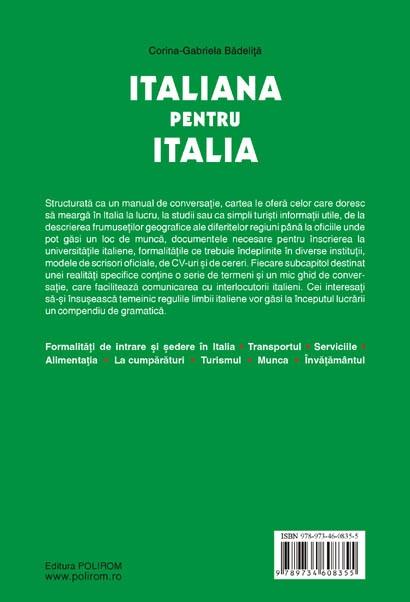 Structurata ca un manual de conversatie, cartea le ofera celor care doresc sa mearga in Italia la lucru, la studii sau ca simpli turisti informatii utile, de la descrierea frumusetilor geografice ale diferitelor regiuni pina la actele si sumele de bani necesare la vama, adresele unde pot gasi un loc de munca, formalitatile ce trebuie indeplinite in diferitele institutii italiene, modele de scrisori oficiale, de CV-uri si de cereri. Fiecare subcapitol destinat unei realitati specifice contine o serie de termeni si un mic ghid de conversatie, care faciliteaza comunicarea cu interlocutorii italieni. Cei interesati sa-si insuseasca temeinic regulile limbii italiene vor gasi la inceputul lucrarii un compendiu de gramatica.