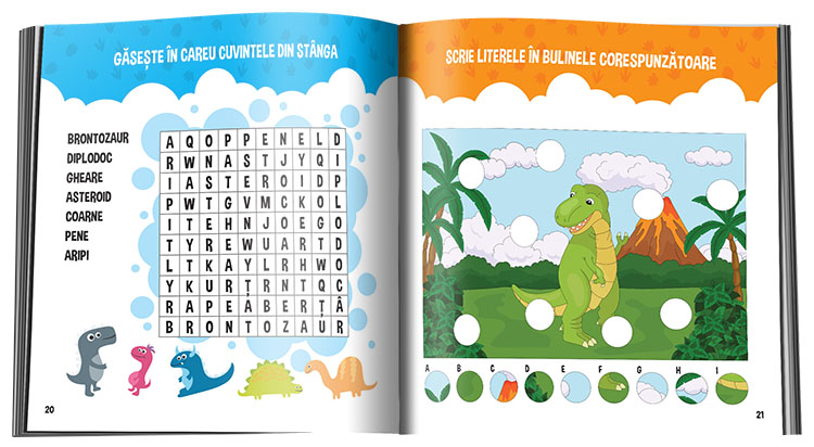 Descoperă cei mai cunoscuți și mai simpatici dinozauri și rezolvă tot felul de activități colorate și amuzante alături de ei!
