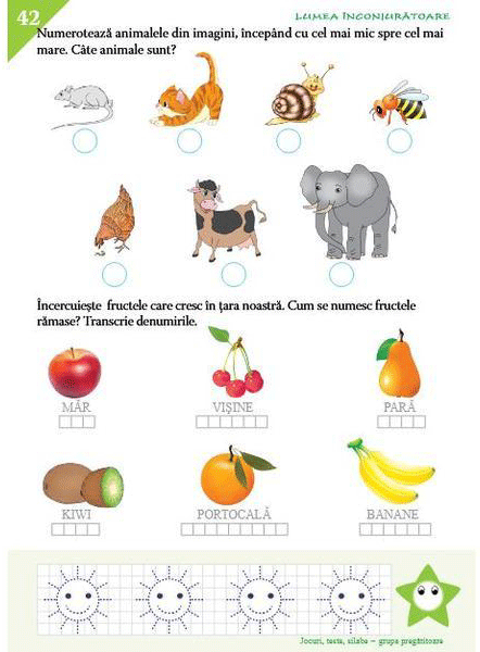 • matematica (scrierea cifrelor până la 10, adunări și scăderi simple, figuri geometrice, gimnastica minții, etc.)