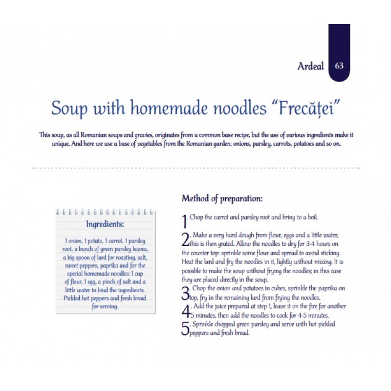 The present book wants to be an informative one about what the Romanian gastronomy has preserved as traditional recipes (cooked by at least three generations, grandmother, mother and daughter...), gastronomy that is equal to our identity, as Romanian people of the Balkan, Latin origins and much more. And because a whole country is made up of many well-welded parts, apart from the recipes that defined the national gastronomy as one of its own, with its own identity, the regional gastronomy or the recipes that were born in the regions of Romania are diverted from one-a mother recipe, differences consisting in the taste of local ingredients or different cooking techniques used.