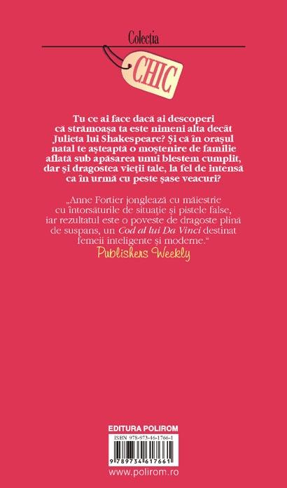 Tu ce ai face daca ai descoperi ca stramoasa ta este nimeni alta decit Julieta lui Shakespeare? Si ca in orasul natal te asteapta o mostenire de familie aflata sub apasarea unui blestem cumplit, dar si dragostea vietii tale, la fel de intensa ca in urma cu peste sase veacuri ?