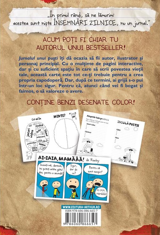 Jurnalul unui puşti îţi dă ocazia să fii autor, ilustrator şi personaj principal. Cu o mulţime de pagini interactive, dar şi cu suficient spaţiu în care să scrii povestea vieţii tale, această carte este tot ce-ţi trebuie pentru a crea propria capodoperă. Dar, după ce termini, ai grijă s-o pui într-un loc sigur. Pentru că, atunci când vei fi bogat şi faimos, chestia asta o să valoreze o avere.