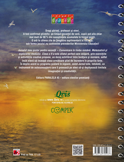 Jurnalul meu școlar pentru vacanță - Comunicare în limba română. Matematică şi explorarea mediului. Clasa a II-a este aliatul perfect care asigură, prin exercițiile și activitățile creative propuse, un dozaj echilibrat între învățare și recreere, astfel încât elevii să înceapă clasa următoare plini de încredere în propriile forțe.