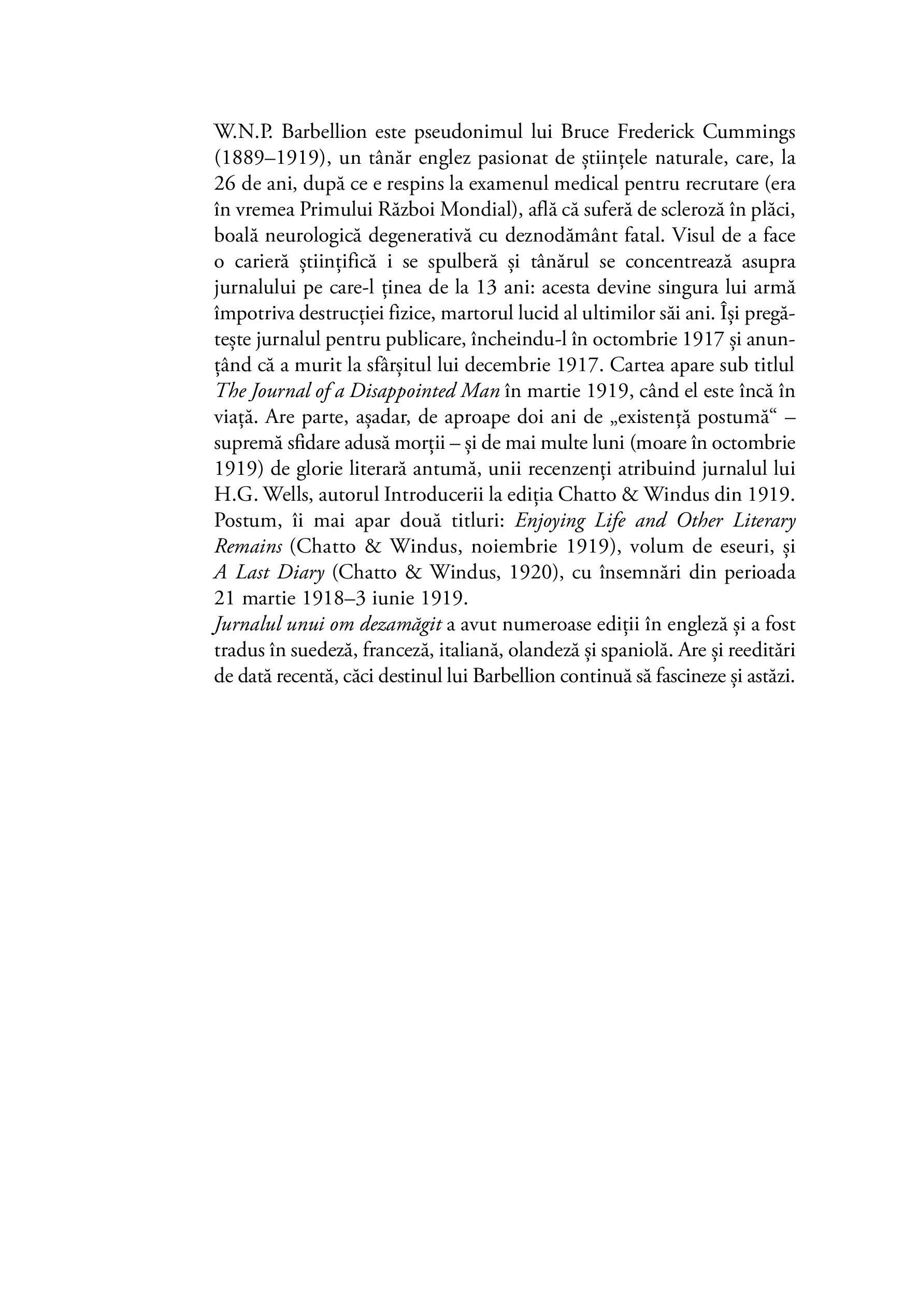 Povestea Jurnalului merită știută înainte de lectură. W.N.P. Barbellion este pseudonimul lui Bruce Frederick Cummings, un tânăr englez pasionat de științele naturale, care în 1915, respins la examenul medical pentru recrutare, află că suferă de scleroză în plăci, boală cu deznodământ fatal. Visul de a face o carieră științifică i se spulberă și tânărul se concentrează asupra jurnalului pe care-l ținea de la 13 ani: acesta devine singura lui armă împotriva destrucției fizice, martorul lucid al ultimilor săi ani. Își pregătește jurnalul pentru publicare, încheindu-l în octombrie 1917 și anunțând că a murit la sfârșitul lui decembrie 1917. The Journal of a Disappointed Man apare în martie 1919, când el este încă în viață. Barbellion are parte, așadar, de aproape doi ani de „existență postumă“ – supremă sfidare adusă morții – și de mai multe luni (moare în octombrie 1919) de glorie literară antumă.