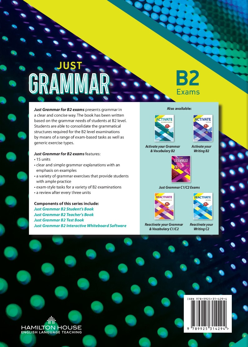 Just Grammar for B2 presents grammar in a clear and concise way. The book has been written based on the needs relevant to students at B2 level, with grammar presented in an active context. Students are able to consolidate the grammatical structures and vocabulary required for the B2 level examinations by means of a range of exam-based tasks as well as generic exercise types.