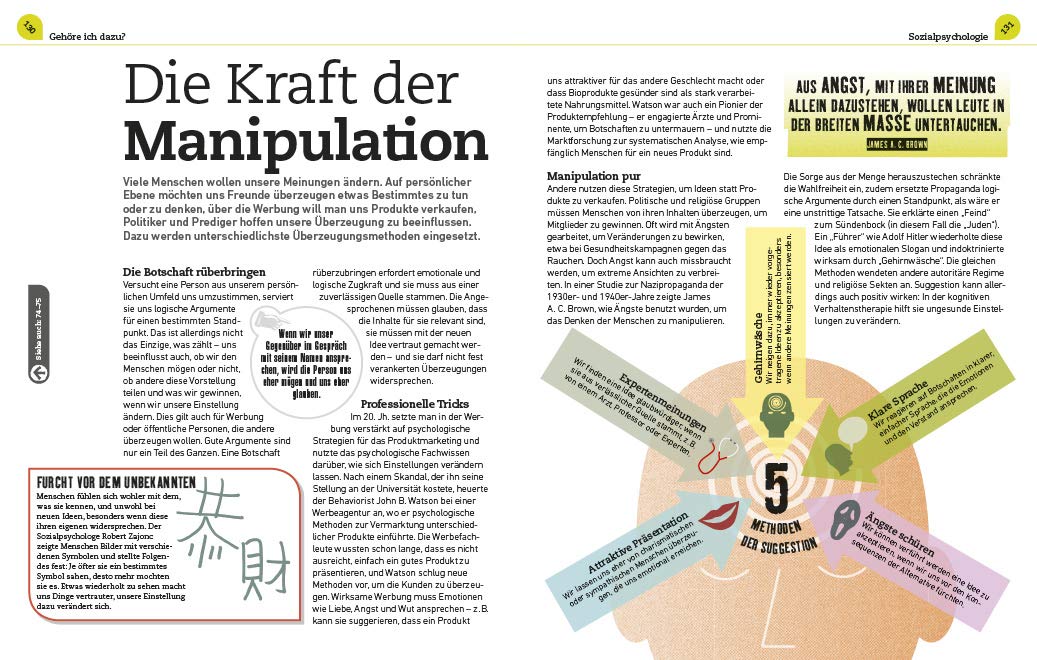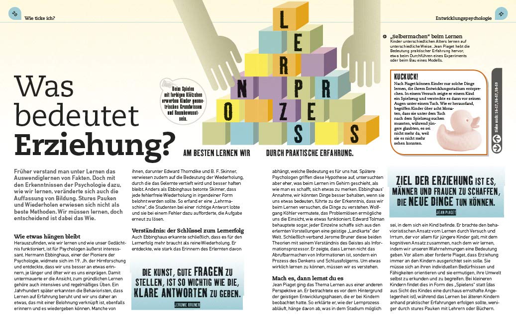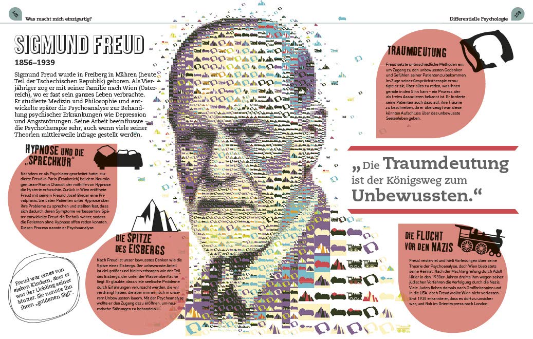 Jeder, der sich mit seiner Gefühlswelt beschäftigen und mit seiner Psyche auseinandersetzen will, findet in dem Psychologie-Buch Infos aus dem passenden Fachbereich: Wie ticke ich? (Entwicklungspsychologie) Wie arbeitet mein Gehirn? (Biologische Psychologie) Wie funktioniert mein Geist? (Kognitive Psychologie) Was macht mich einzigartig? (Differentielle Psychologie) Gehöre ich dazu? (Sozialpsychologie).