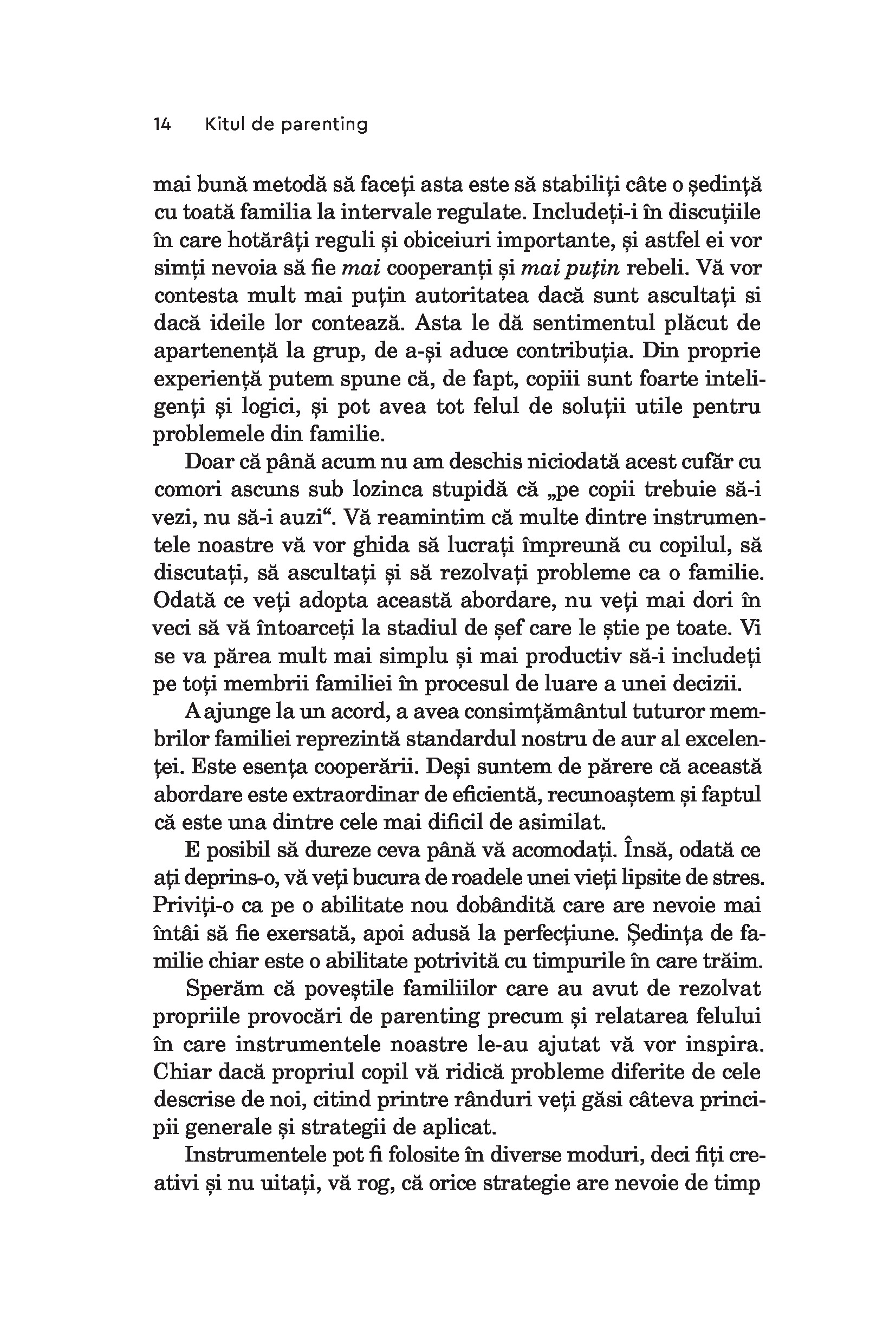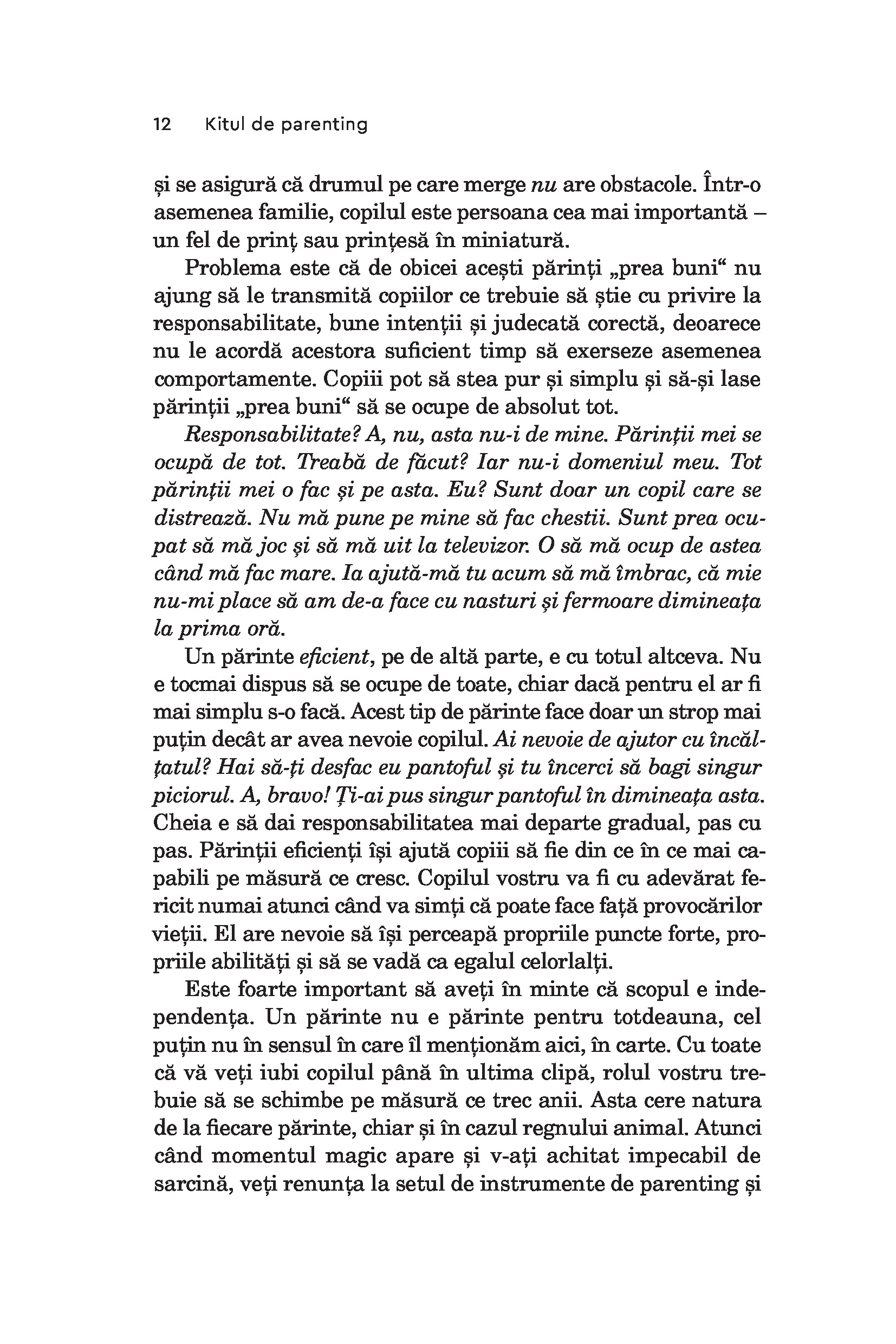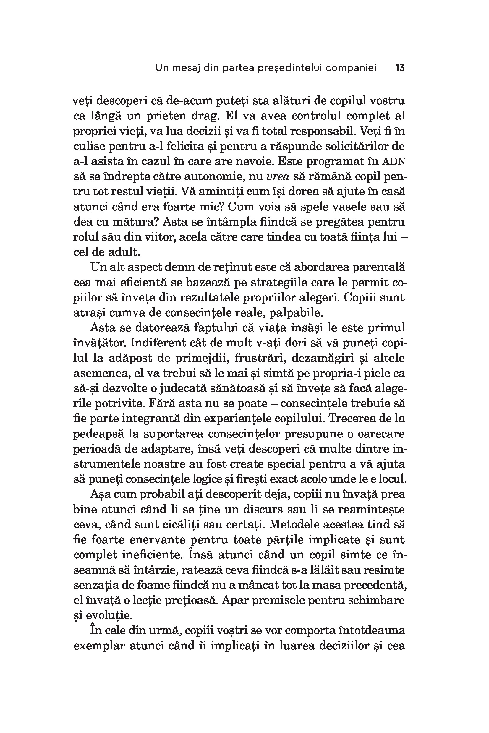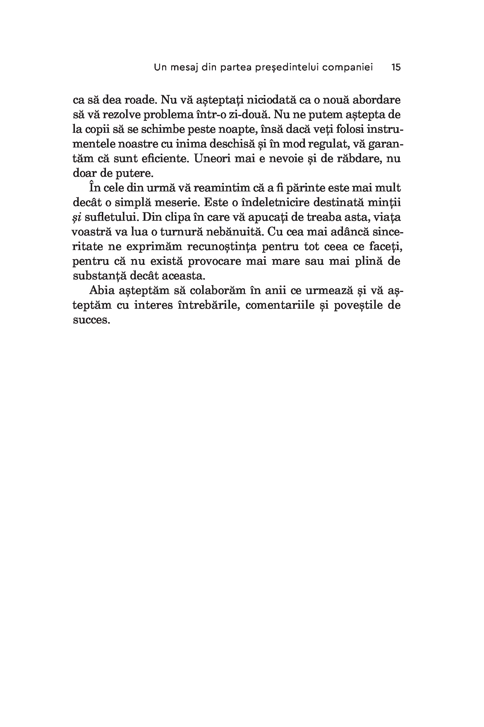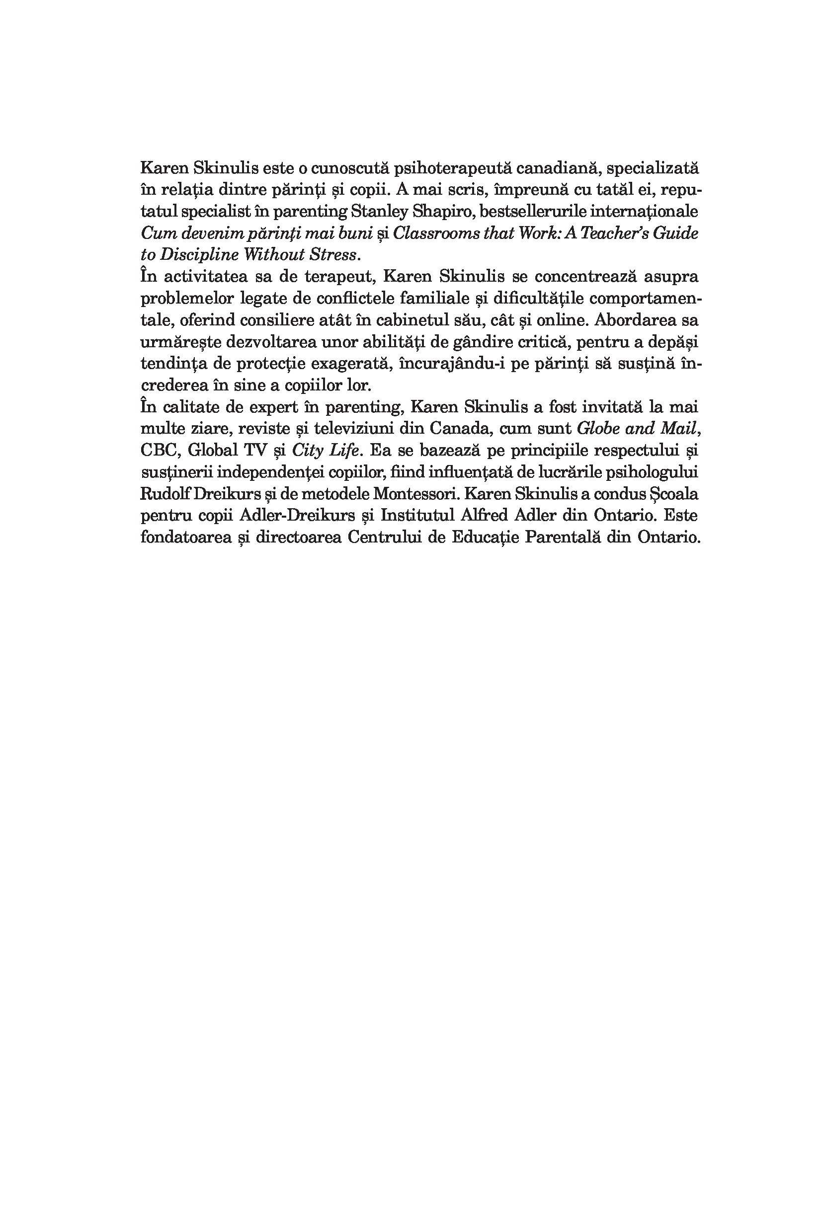Găsim aici instrumente precum „banda adezivă invizibilă“, „centura de siguranță pentru scaunul de la masa“ ori „clopoțelul pentru ușa de la dormitor“. Pare o joacă, dar nu e. Autoarea este un specialist reputat, cu idei provenind de la școala psihologului adlerian Rudolf Dreikurs, care propune un stil de parenting diferit de clasica alternanță de recompense și pedepse. Primează respectul și cooperarea cu copiii noștri, mult mai creativi și mai plini de resurse atunci când îi încurajăm decât atunci când le interzicem să fie așa cum sunt ei. Karen Skinulis este și profesoară Montessori, și ne convinge că cel mai bine copiii învață atunci când sunt implicați activ și li se oferă libertate într-un mediu structurat.