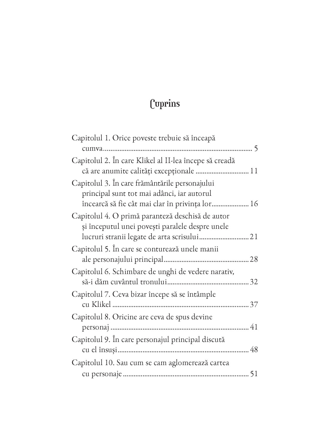 Aventurile lui Klikel se împletesc cu peripeţiile unui scriitor care se lasă invadat de personajele sale, uitând unde se află linia de demarcaţie dintre realitate și ficţiune, ba chiar prelungind-o dincolo de masa lui de scris…