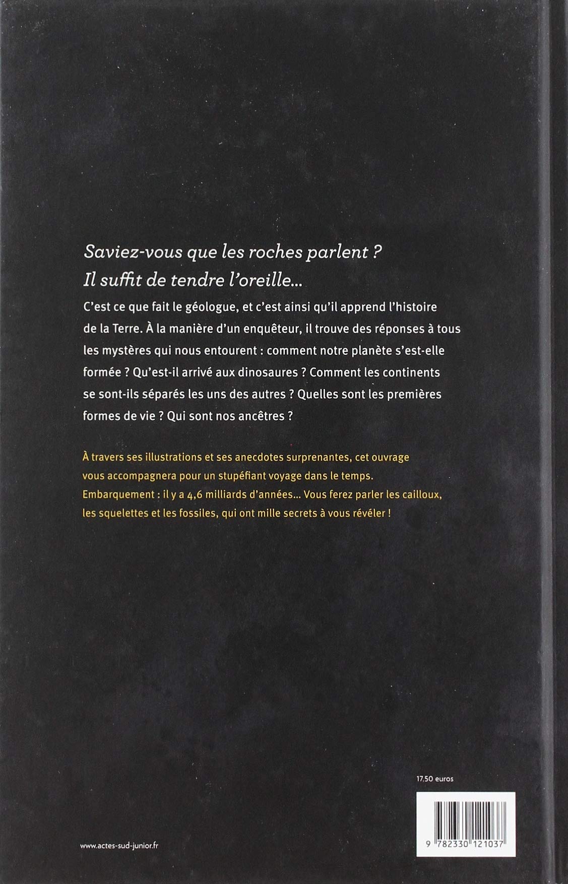 Saviez-vous que les roches parlent ? Il suffit de tendre l'oreille... C'est ce que fait le géologue, et c'est ainsi qu'il apprend l'histoire de la Terre. A la manière d'un enquêteur, il trouve des réponses à tous les mystères qui nous entourent : comment notre planète s'est-elle formée ? Qu'est-il arrivé aux dinosaures ? Comment les continents se sont-ils séparés les uns des autres ? Quelles sont les premières formes de vie ? Qui sont nos ancêtres ? A travers ses illustrations et ses anecdotes surprenantes, cet ouvrage vous accompagnera pour un stupéfiant voyage dans le temps. Embarquement : il y a 4,6 milliards d'années... Vous ferez parler les cailloux, les squelettes et les fossiles, qui ont mille secrets à vous révéler !