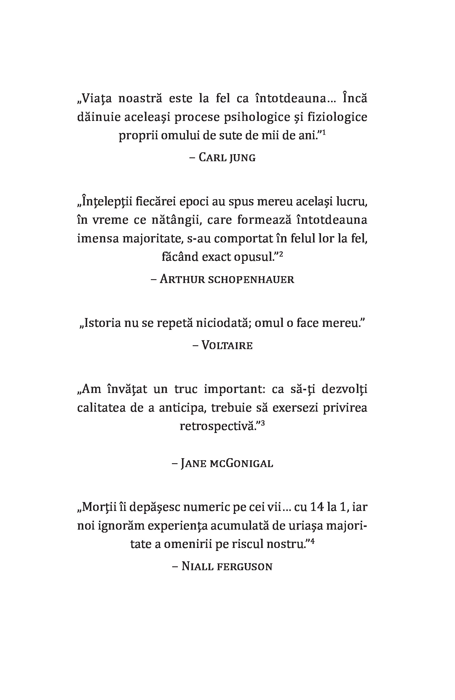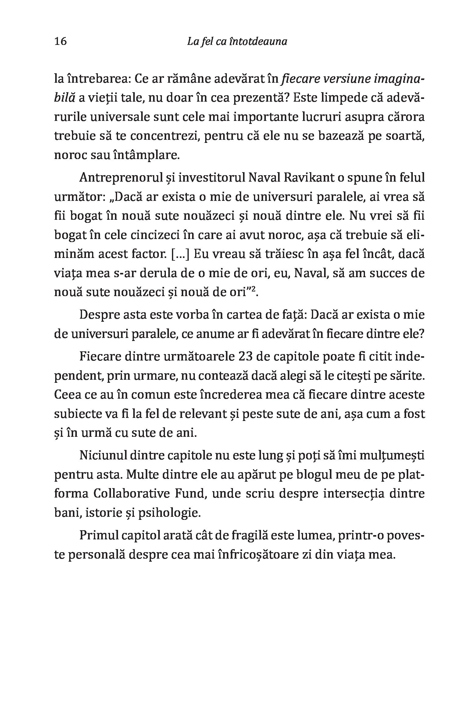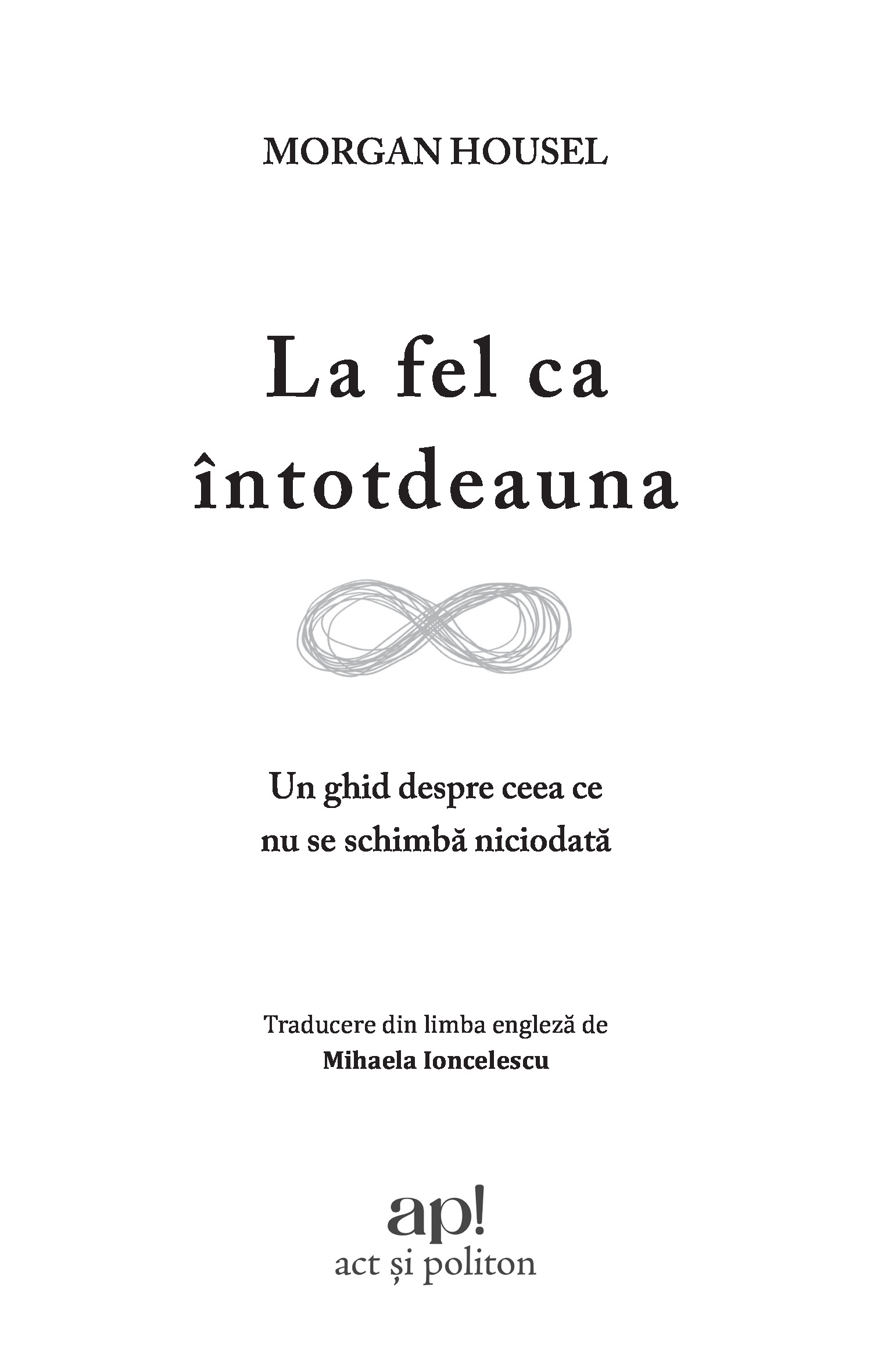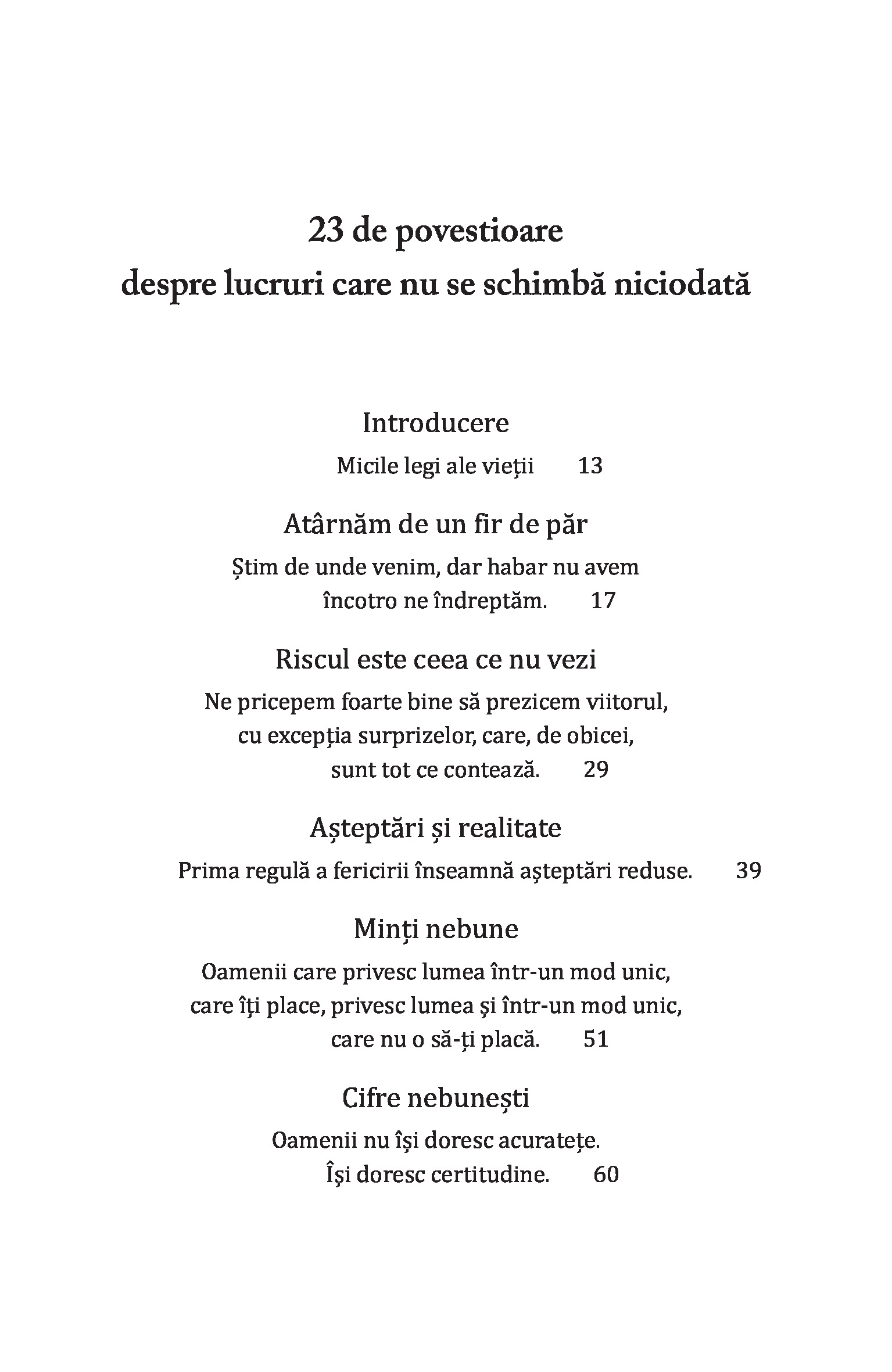De fapt, lectura acestei cărți îți dă senzația că stai de vorbă cu specialiști dintr-o multitudine de domenii (economiști, istorici, psihologi, sociologi) care îți schimbă 100% perspectiva asupra unor chestiuni pe care credeai că le înțelegi perfect. Morgan Housel consideră că există o modalitate mult mai simplă de a intui viitorul și de a ne pregăti mai bine să-i facem față, decât studiind tiparele repetitive ale istoriei. El este de părere că viitorul nu ne va lua niciodată prin surprindere atât timp cât vom fi la curent cu acele legi ale vieții care nu se schimbă niciodată și care nu se vor schimba niciodată. Și exact despre asta este vorba în cartea de față. Despre 23 de adevăruri general valabile de care ar trebui să ținem cont pentru a gestiona mai bine prezentul și pentru a face față mai bine viitorului.