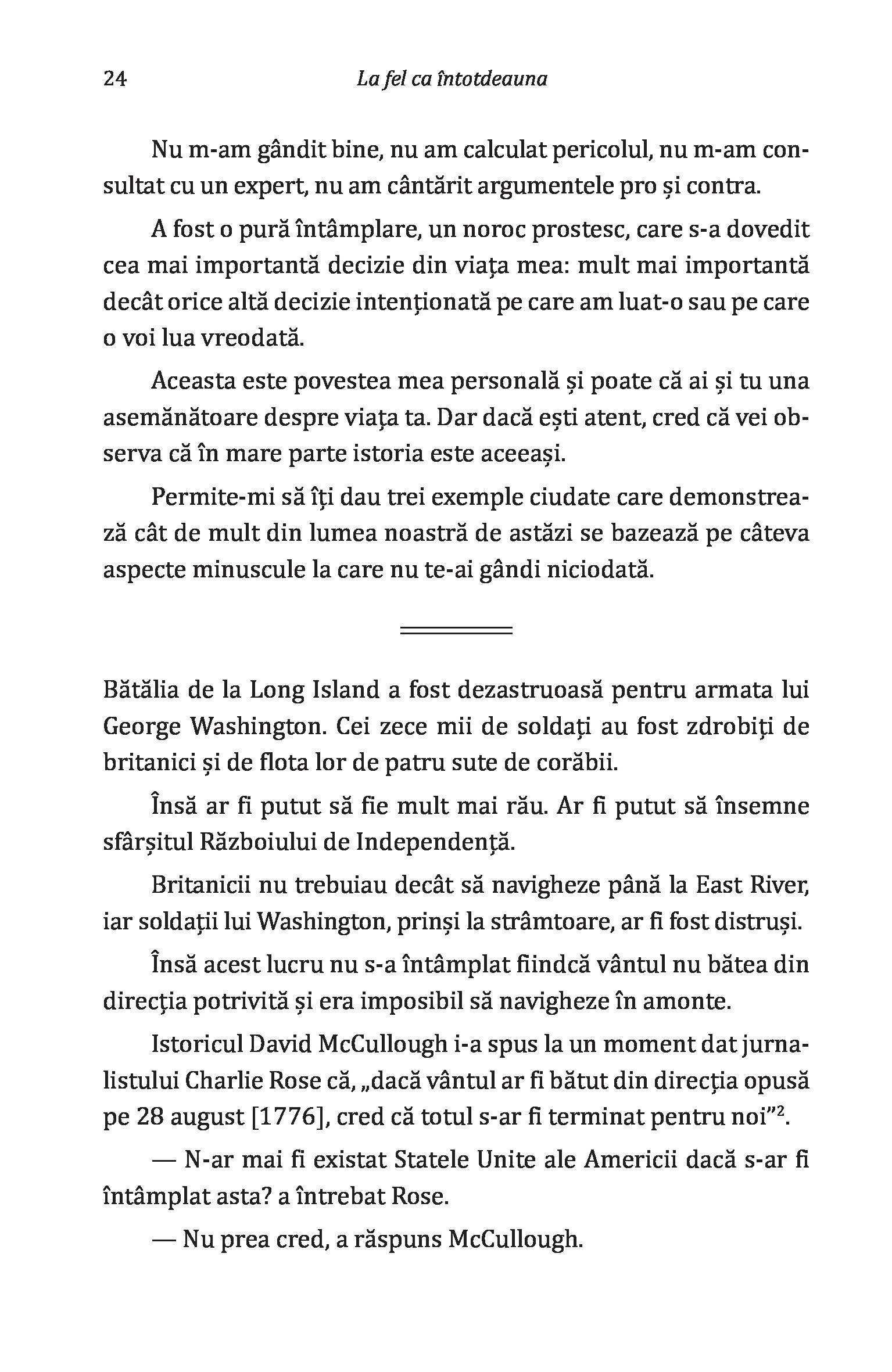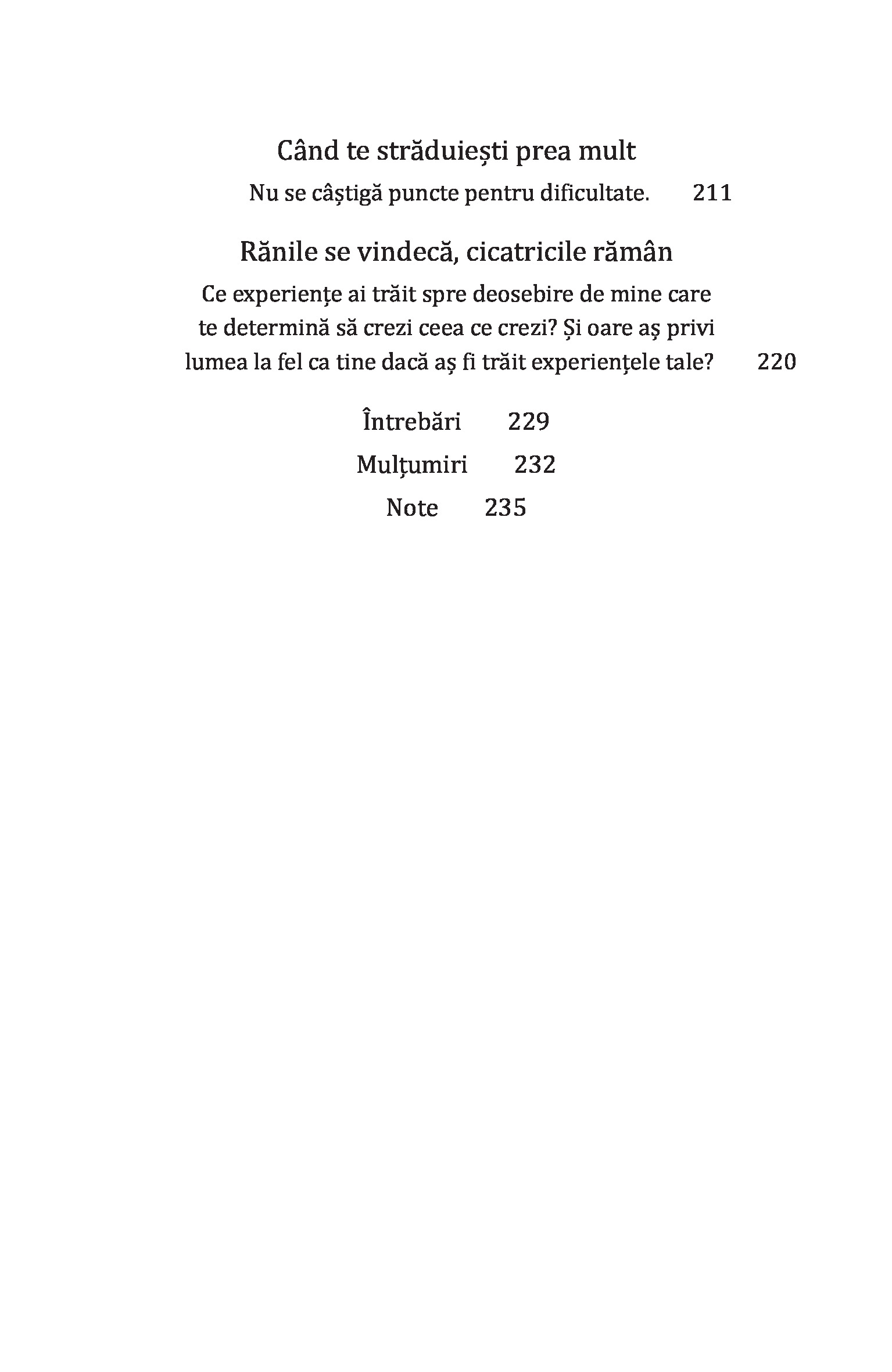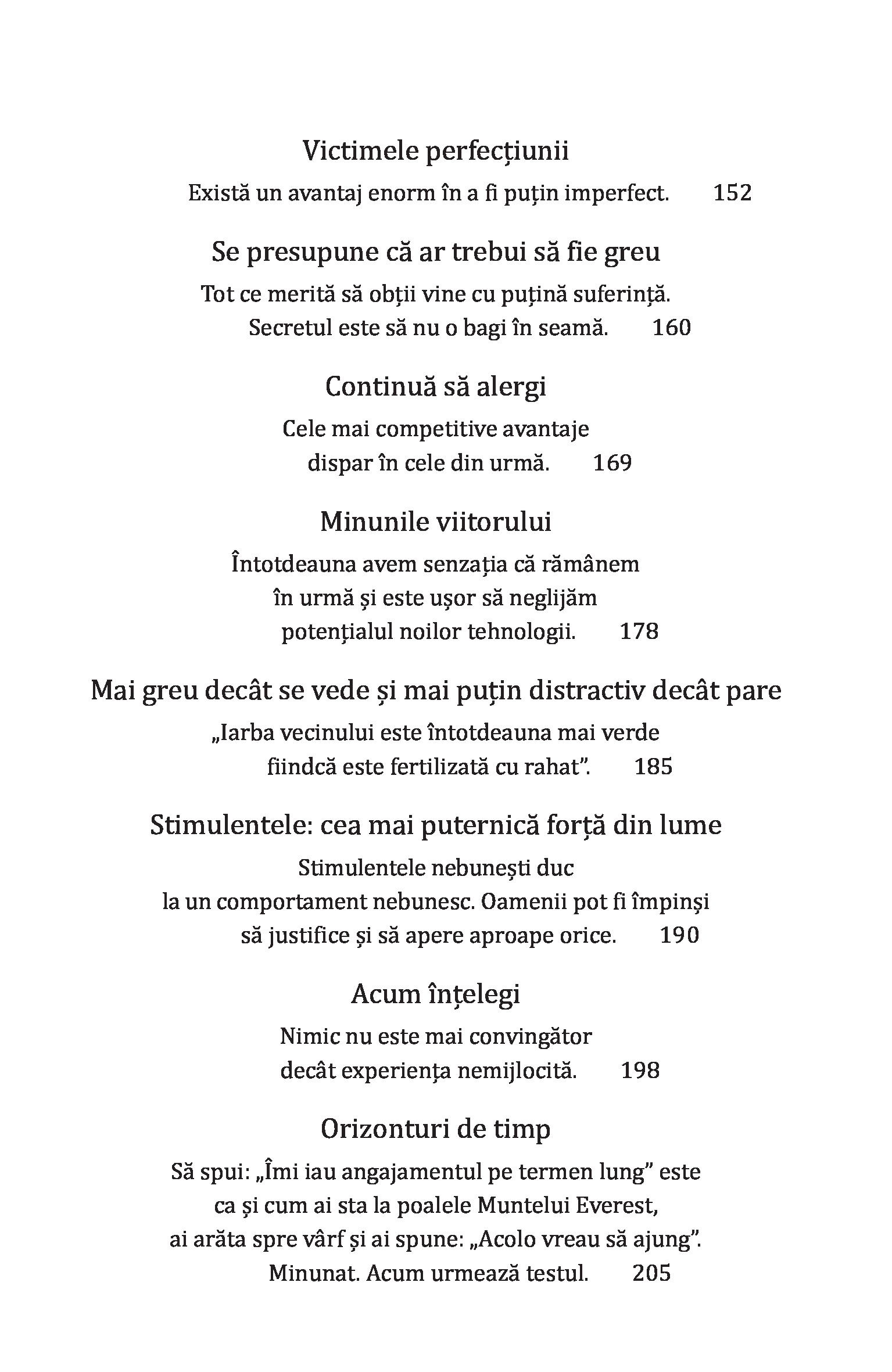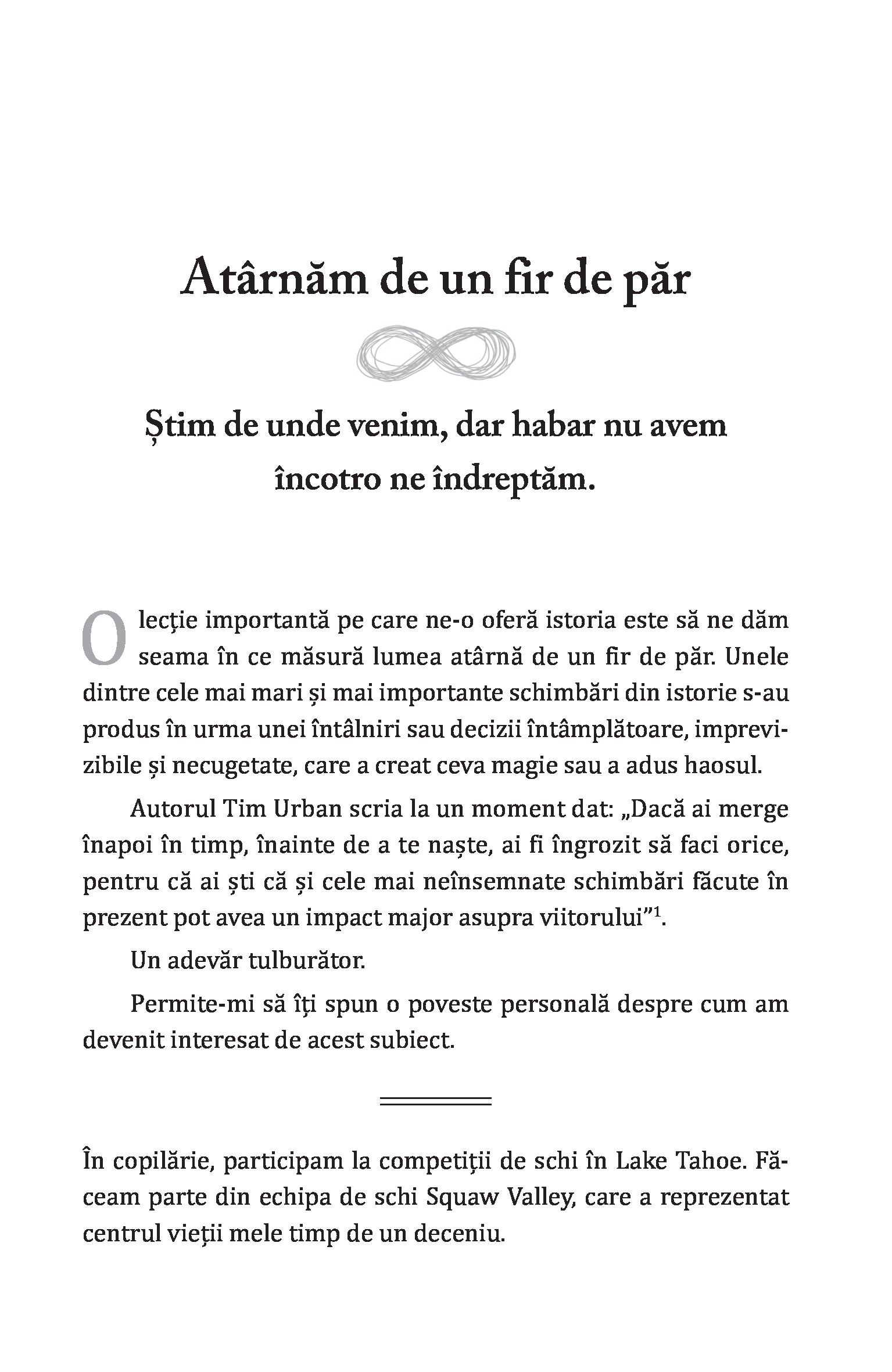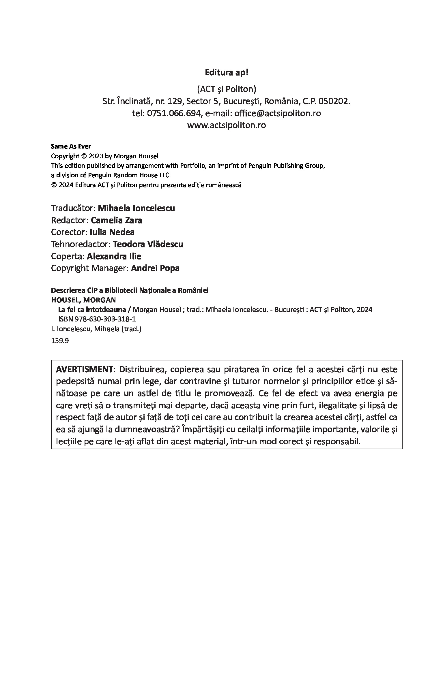 De fapt, lectura acestei cărți îți dă senzația că stai de vorbă cu specialiști dintr-o multitudine de domenii (economiști, istorici, psihologi, sociologi) care îți schimbă 100% perspectiva asupra unor chestiuni pe care credeai că le înțelegi perfect. Morgan Housel consideră că există o modalitate mult mai simplă de a intui viitorul și de a ne pregăti mai bine să-i facem față, decât studiind tiparele repetitive ale istoriei. El este de părere că viitorul nu ne va lua niciodată prin surprindere atât timp cât vom fi la curent cu acele legi ale vieții care nu se schimbă niciodată și care nu se vor schimba niciodată. Și exact despre asta este vorba în cartea de față. Despre 23 de adevăruri general valabile de care ar trebui să ținem cont pentru a gestiona mai bine prezentul și pentru a face față mai bine viitorului.