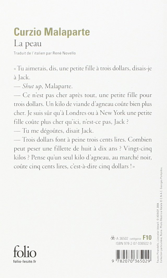 En 1943, Curzio Malaparte, grand correspondant de guerre et officier de liaison auprs des Allis, se trouve Naples avec les troupes amricaines venues librer le pays. Entour de ces hommes frachement dbarqus en Europe, que les annes de combat et de dsillusion n'ont pas encore abms, l'auteur entreprend une tragique odysse travers une Italie en ruine, livre la misre et au chaos. Partout on se livre aux plus viles exactions. Comme un cho au tumulte des hommes, le Vsuve entre en ruption, les animaux meurent au supplice, la terre se dchire. De page en page, la complexit de ces destins happs par la brutalit de l'Histoire se dploie sous l'oeil de l'auteur, intransigeant jusqu' l'coeurement avec la cruaut des faits. Et c'est l la force de son rcit : outre la beaut de son style, c'est sa capacit s'indigner et indigner le monde qui demeure remarquable. Curzio Malaparte poursuit avec La Peau sa magistrale entreprise de tmoignage sur la Seconde Guerre mondiale.
