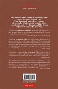 Una dintre capodoperele secolului XX, La rasarit de Eden re-creeaza povestea biblica a lui Cain si Abel in decorul Vaii Salinas din California. Romanul, a carui actiune se intinde din timpul Razboiul Civil american pina la sfirsitul Primului Razboi Mondial, urmareste conflictele dintre doua generatii de frati, incepind cu Adam si Charles Trask. Adam se casatoreste cu frumoasa si malefica prostituata Cathy Ames, care il paraseste chiar in noaptea nuntii pentru fratele sau, Charles. Dupa ce da nastere gemenilor Aron si Caleb, Cathy il impusca pe Adam si se intoarce la vechea sa profesie. Dupa ce Caleb ii dezvaluie lui Adam adevarul despre mama lor, acesta pleaca in razboi si este ucis pe cimpurile de batalie din Franta. In anul 1955, romanul La rasarit de Eden a fost ecranizat de regizorul Elia Kazan, cu James Dean in rolul principal.