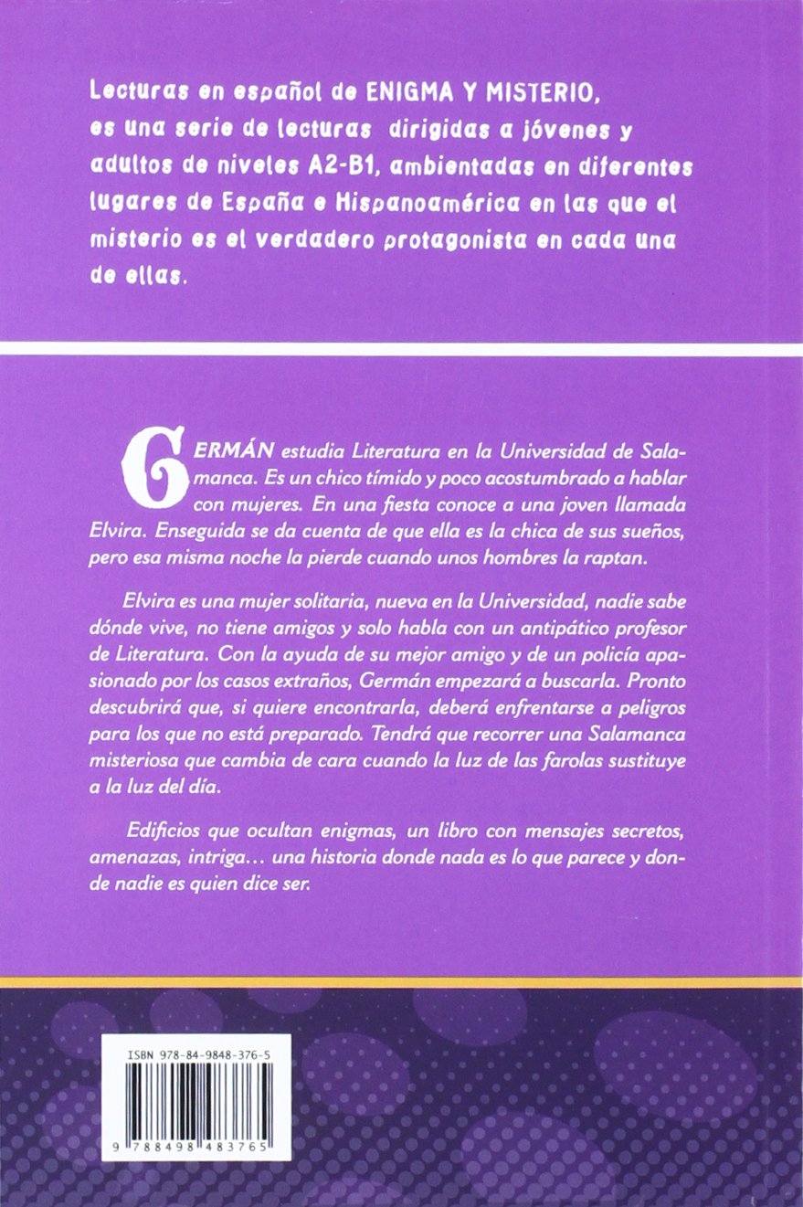 Germàn estudia Literatura en la Universidad de Salamanca. Es un chico timido y poco acostumbrado a hablar con mujeres. En una fiesta conoce a una joven llamada Elvira. Enseguida se da cuenta de que ella es la chica de sus sueños, pero esa misma noche la pierde cuando unos hombres la raptan. Elvira es una mujer solitaria, nueva en la Universidad, nadie sabe donde vive, no tiene amigos y solo habla con un antipatico profesor de Literatura. Con la ayuda de su mejor amigo y de un policia apasionado por los casos extranos, German empezara a buscarla. Pronto descubrira que, si quiere encontrarla, debera enfrentarse a peligros para los que no esta preparado. Tendra que recorrer una Salamanca misteriosa que cambia de cara cuando la luz de las farolas sustituye a la luz del dia. Edificios que ocultan enigmas, un libro con mensajes secretos, amenazas, intriga, una historia donde nada es lo que parece y donde nadie es quien dice ser.