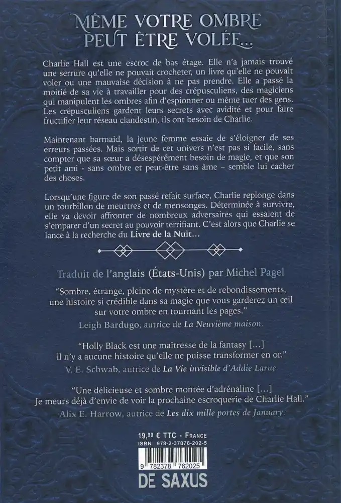 Charlie Hall est une escroc de bas étage. Elle n'a jamais trouvé une serrure qu'elle ne pouvait crocheter, un livre qu'elle ne pouvait voler ou une mauvaise décision à ne pas prendre. Elle a passé la moitié de sa vie à travailler pour des crépusculiens, des magiciens qui manipulent les ombres afin d'espionner ou même tuer des gens. Les crépusculiens gardent leurs secrets avec avidité et pour faire fructifier leur réseau clandestin, ils ont besoin de Charlie.