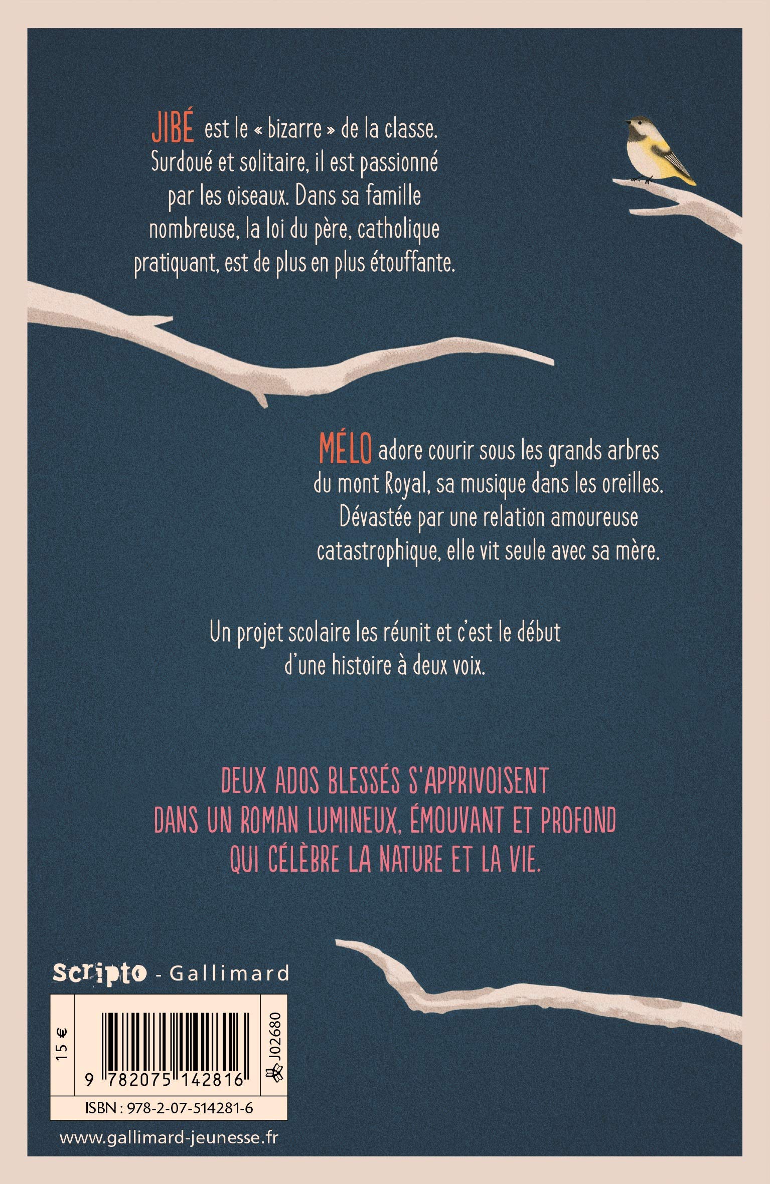 Jibé est le "bizarre" de la classe. Surdoué et solitaire, il est passionné par les oiseaux. Dans sa famille nombreuse, la loi du père, catholique pratiquant, est de plus en plus étouffante.Mélo adore courir sous les grands arbres du mont Royal, sa musique dans les oreilles. Dévastée par une relation amoureuse catastrophique, elle vit seule avec sa mère.Un projet scolaire les réunit et c'est le début d'une histoire à deux voix.
